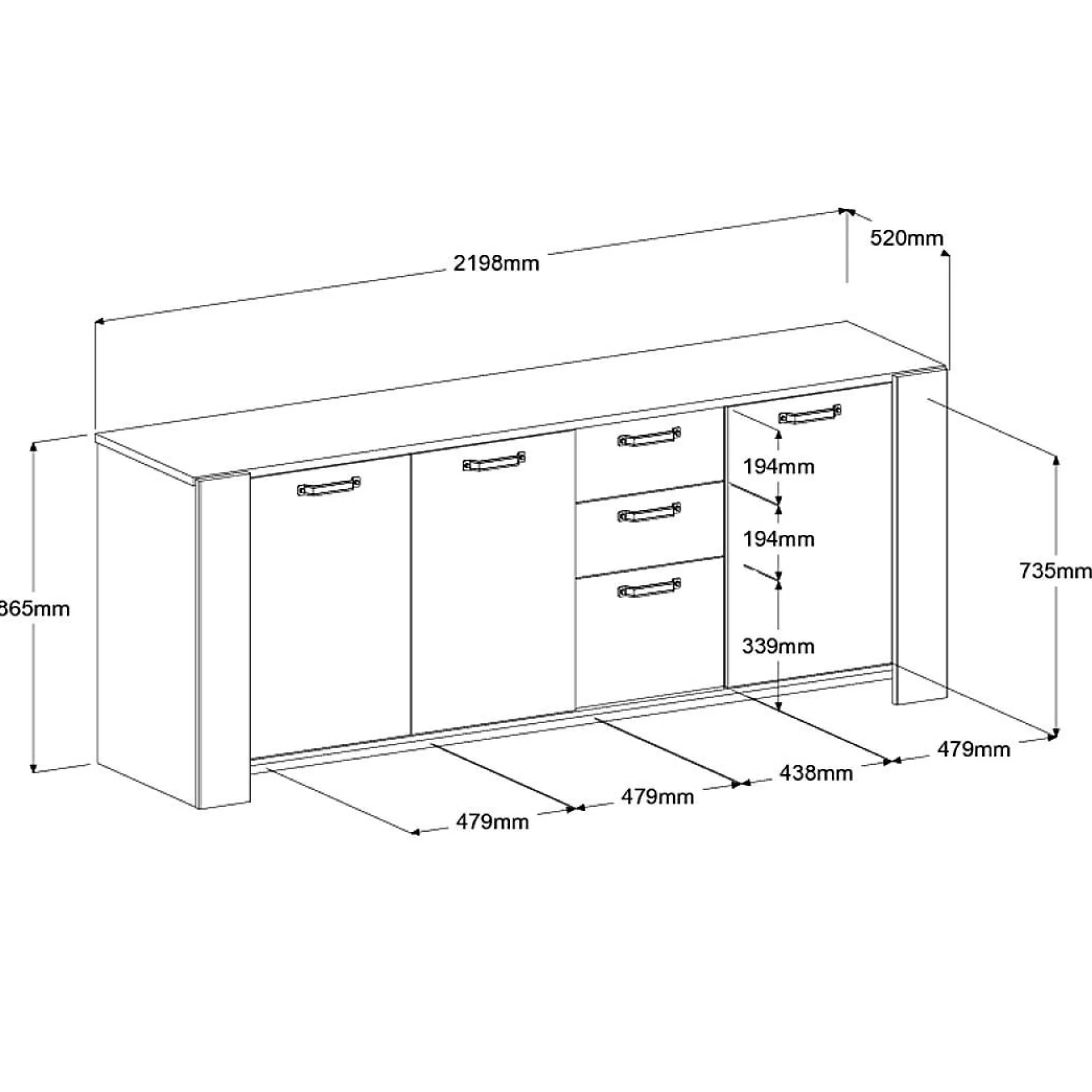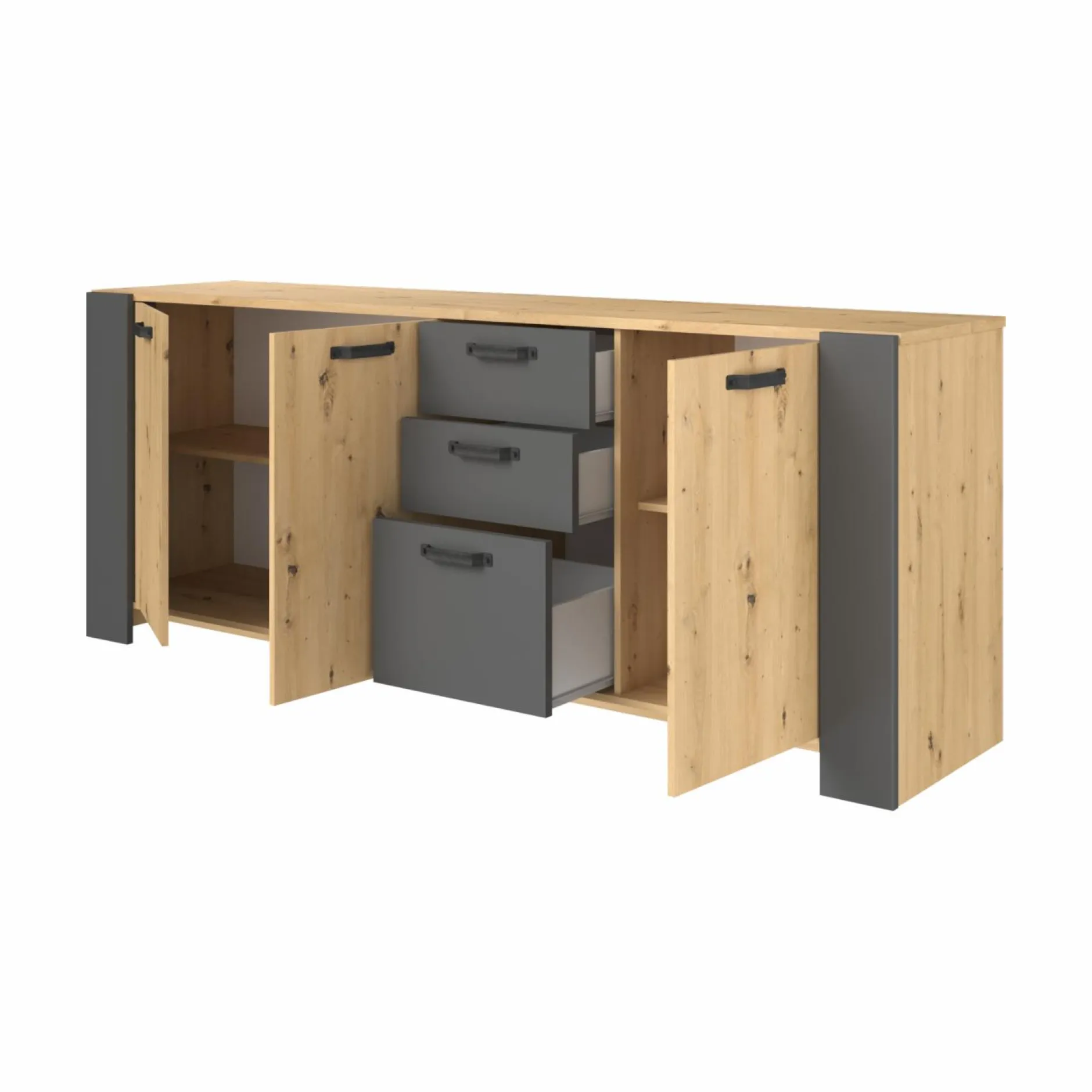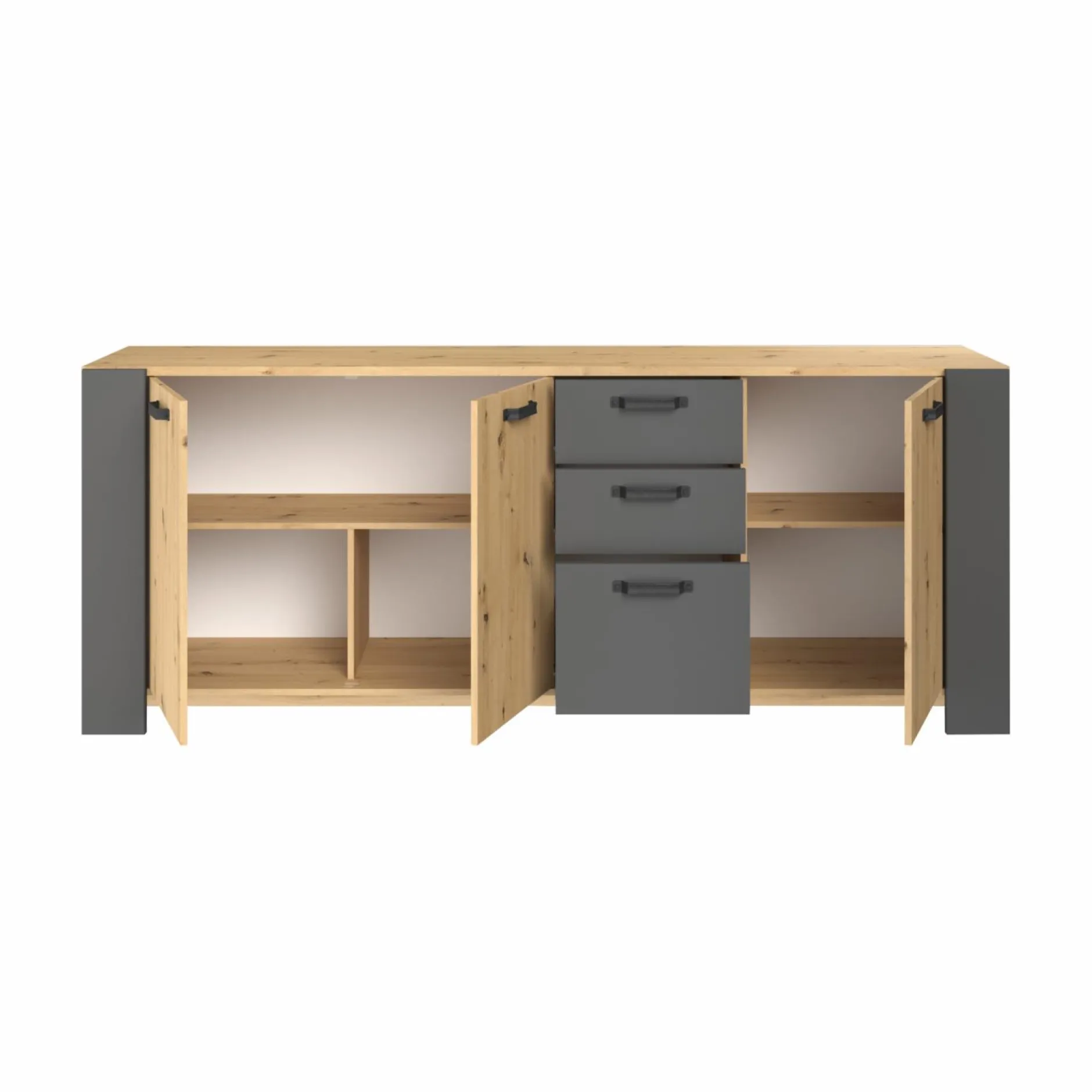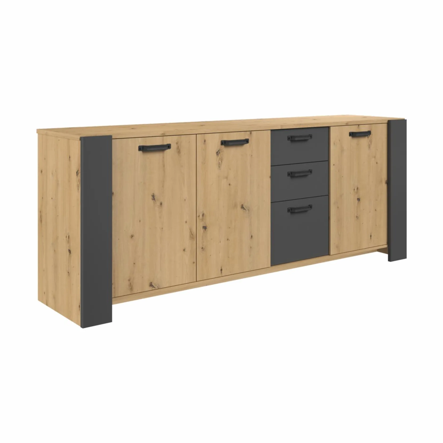 Grâce à ses trois portes et ses trois tiroirs, ce buffet offre un large espace de rangement. Ilest parfait pour accueillir à la fois la vaisselle ou le linge de maison.