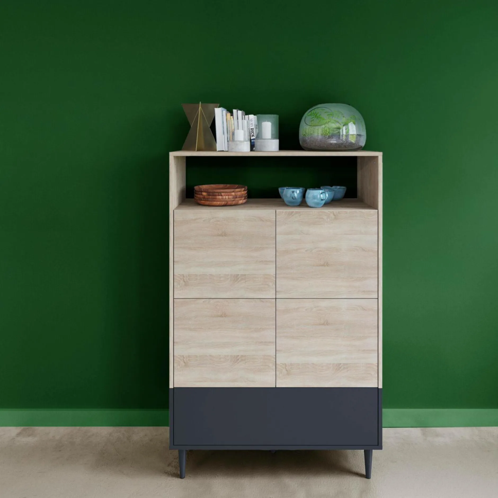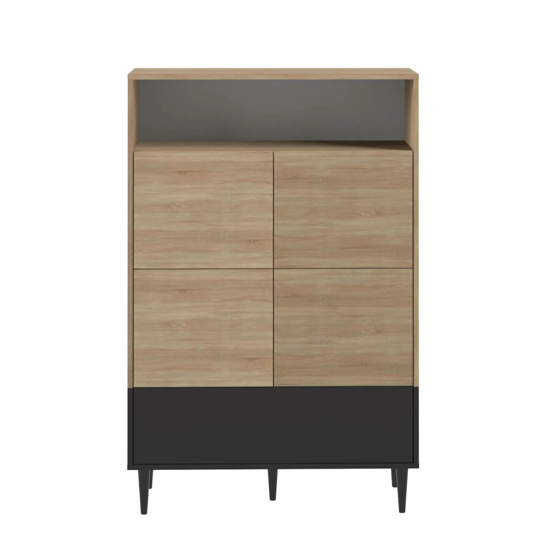 Avec son faible encombrement au sol, il s’adapte à tous les espaces en apportant un maximum de rangement. En plus de sa niche ouverte en haut, ce buffet est composé de 4 niches fermées par 4 portes en son centre et une grande niche fermée en bas sur toute la longueur du meuble. De quoi ranger toutes vos affaires, vaisselles, linge de maison… Et ajouter une touche déco !