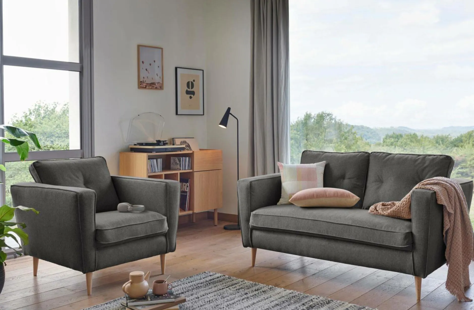 Le canapé Ondine, joliment perché ses ses pieds en bois, offre un style contemporain indéniable.