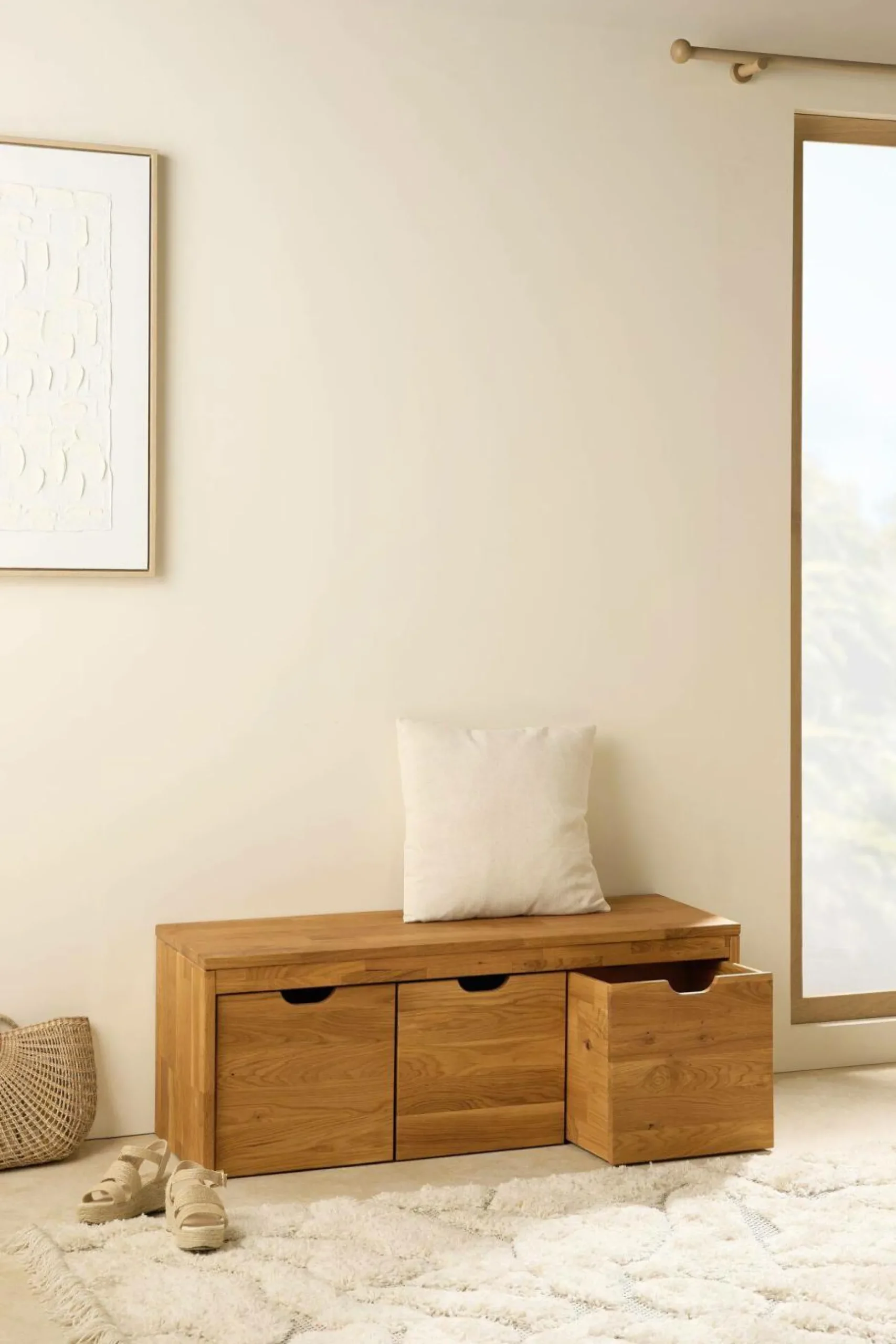 Fabriqué en chêne massif ou en hêtre massif, cet accessoire de rangement est équipé de petites roulettes discrètes, pour se déplacer facilement selon vos besoins. Idéal pour ranger chaussures, accessoires ou autres objets du quotidien, il s’intègre parfaitement sous un banc de la collection Cyriel ou se place à côté pour un rangement supplémentaire.