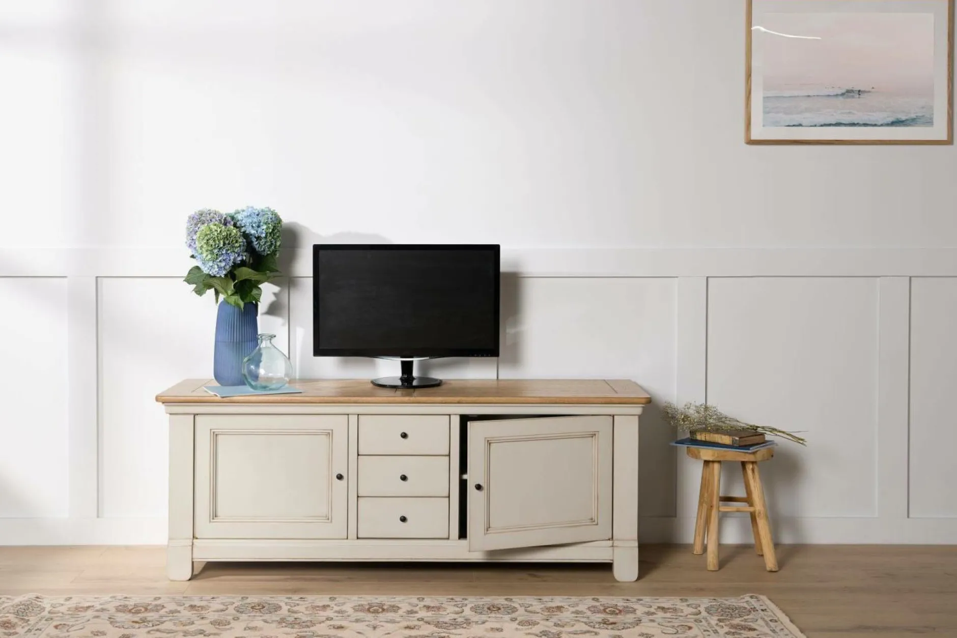 Et si votre télévision s’installait dans un écrin de charme ? Le meuble TV en bois massif Embellie, inspiré des meubles de famille, apporte à votre salon une atmosphère chaleureuse et intemporelle.