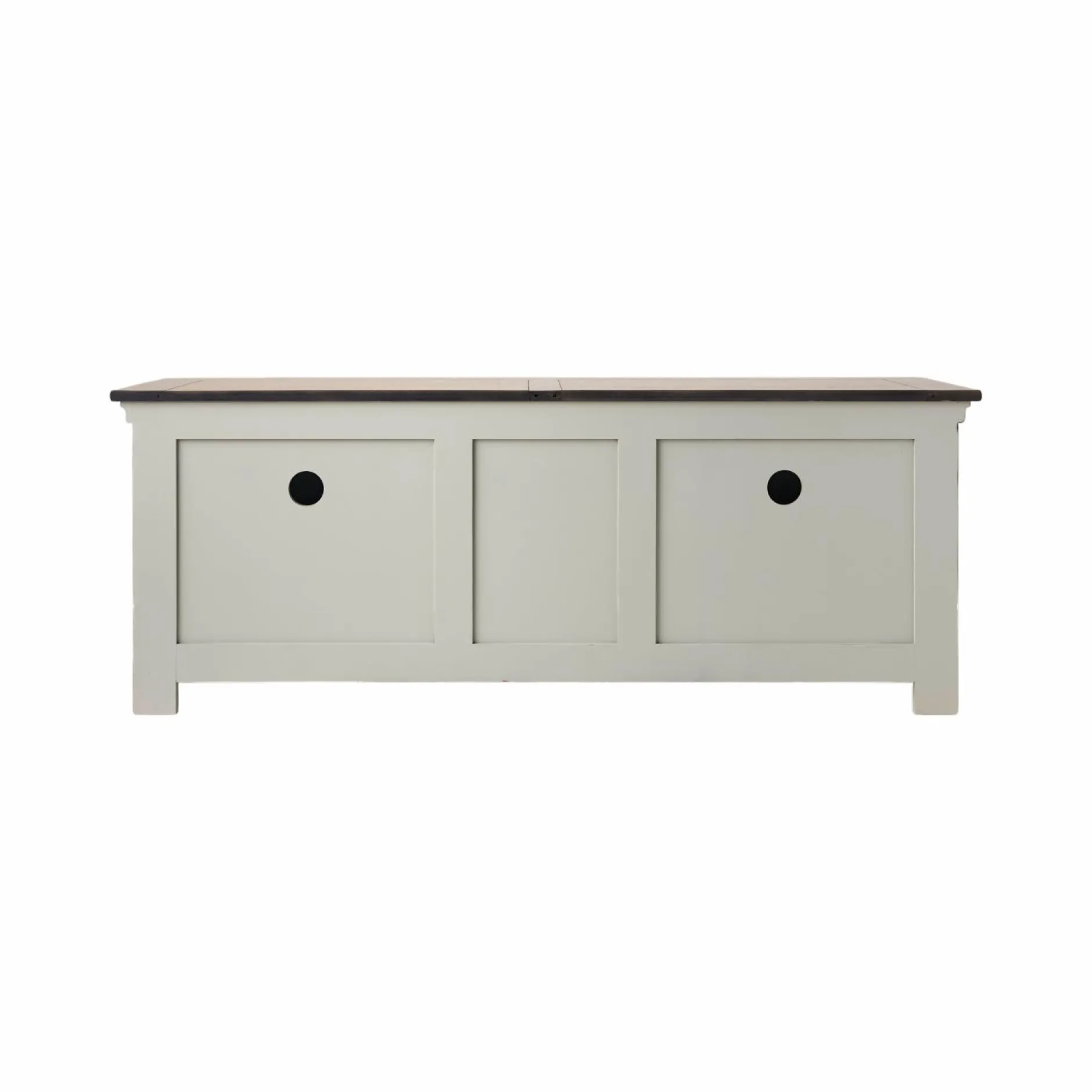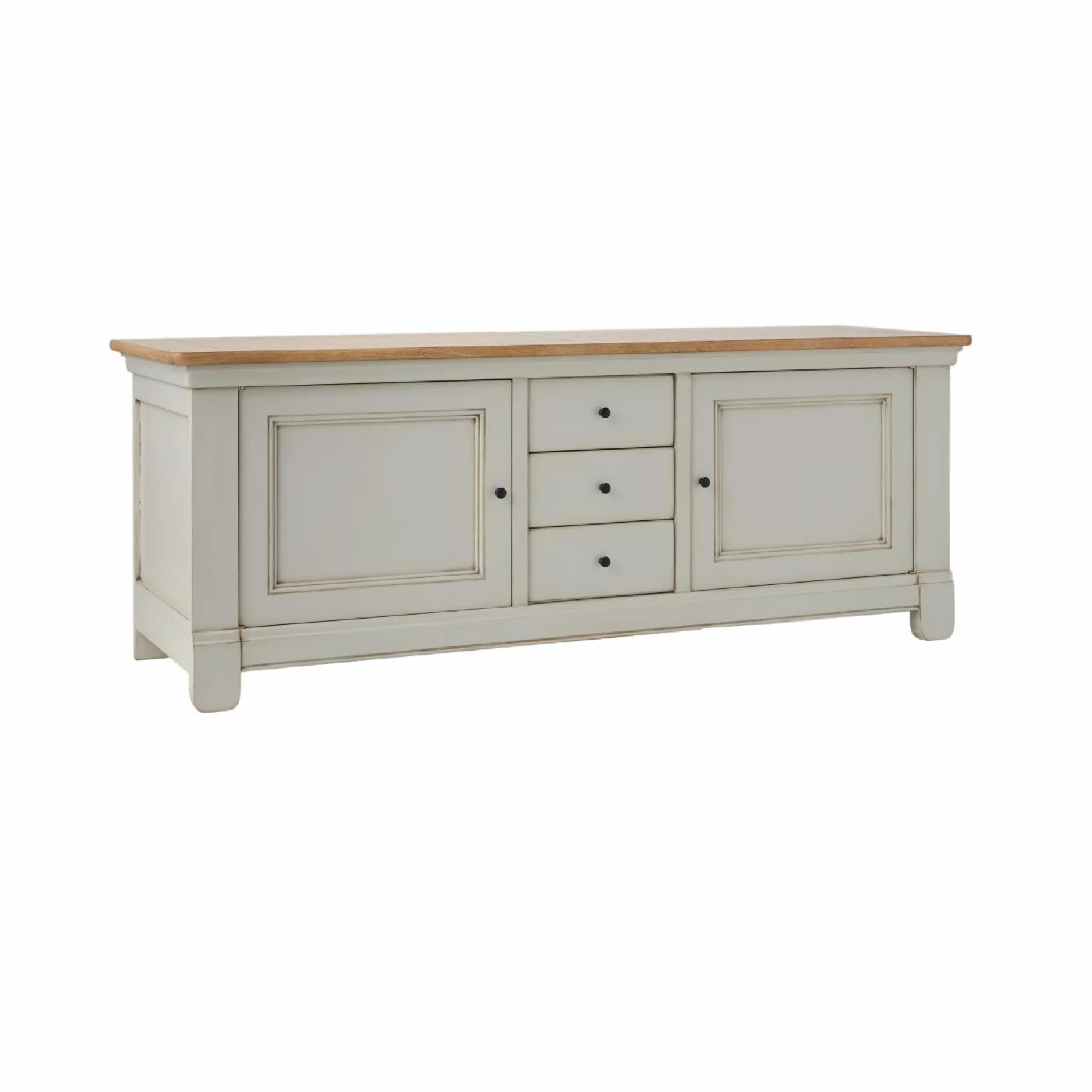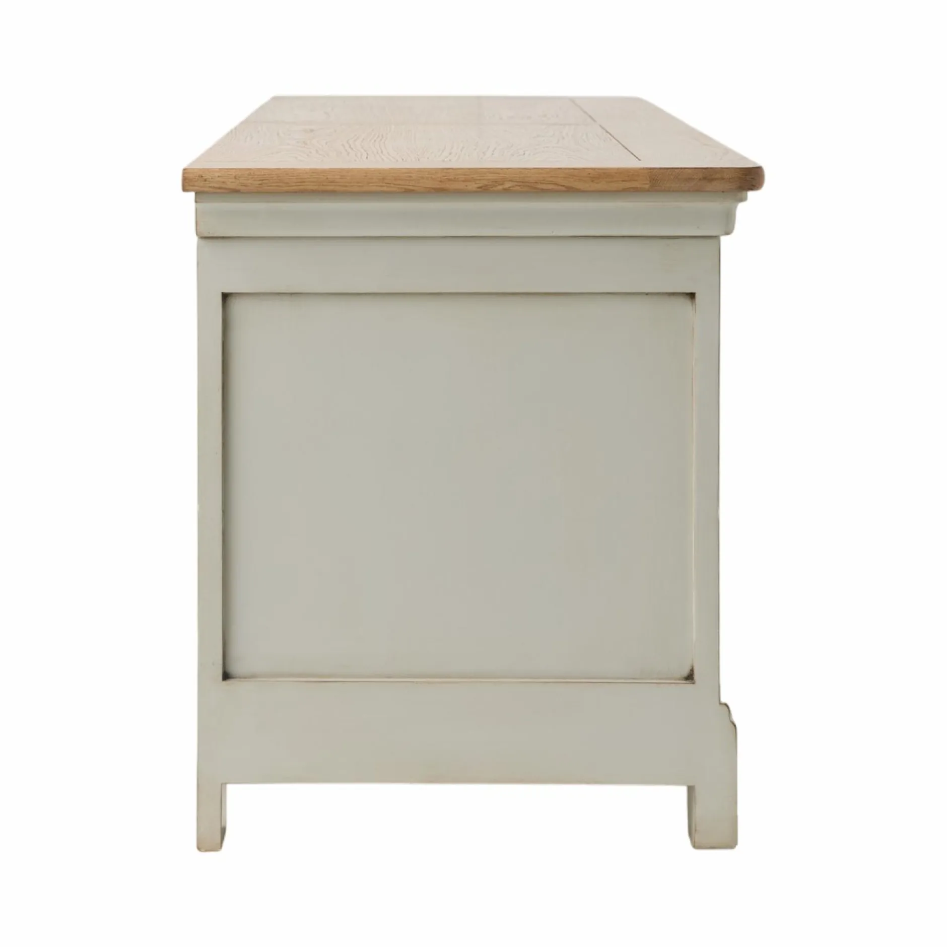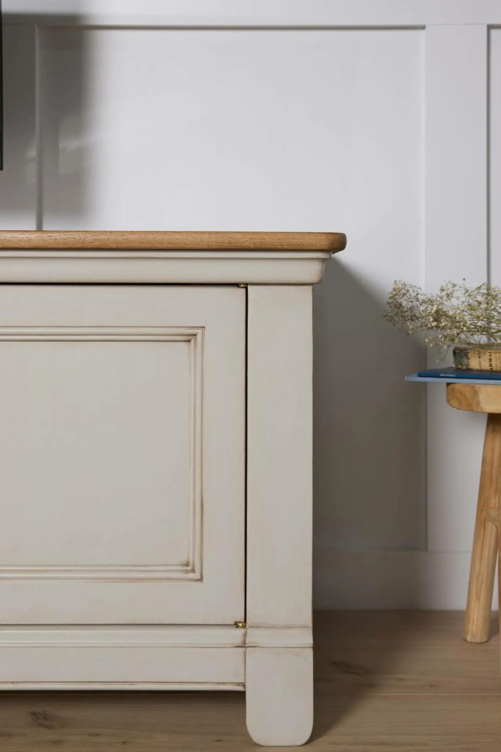 Ses lignes sobres sont mises en valeur par des moulures et un plateau en placage chêne qui réchauffe l’ensemble. Sa finition antiquaire, appliquée à la main, révèle des marques d’usure volontairement visibles, donnant à chaque pièce un caractère unique, comme patiné par le temps.