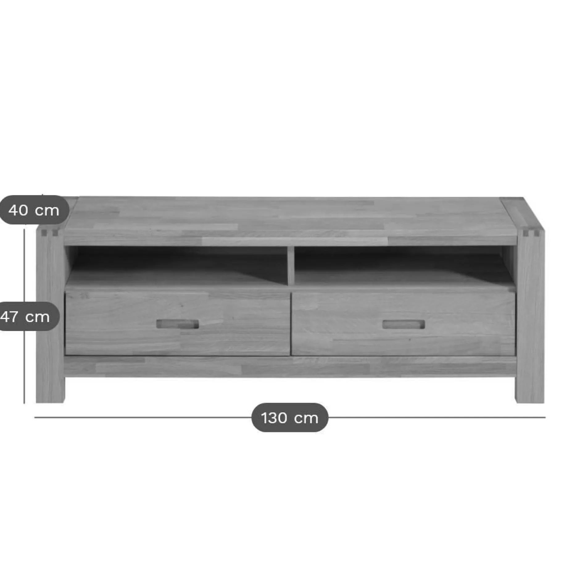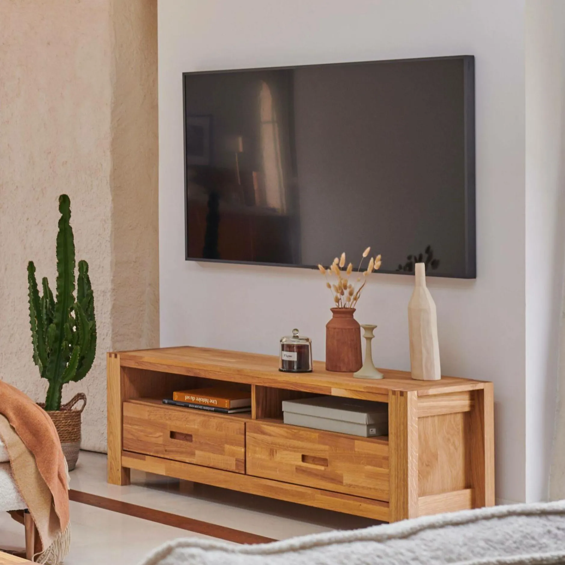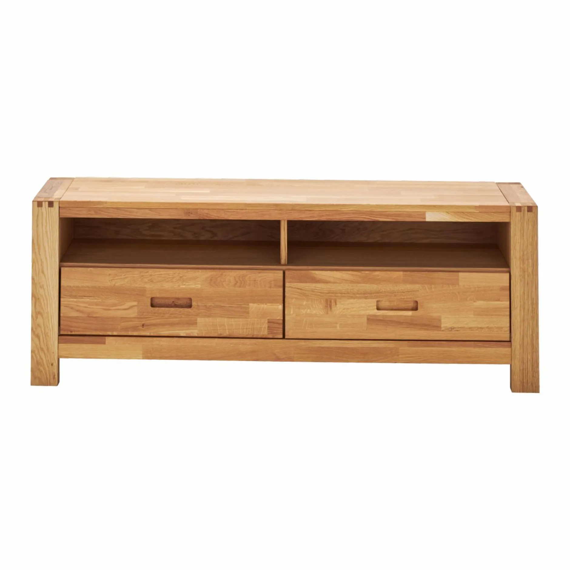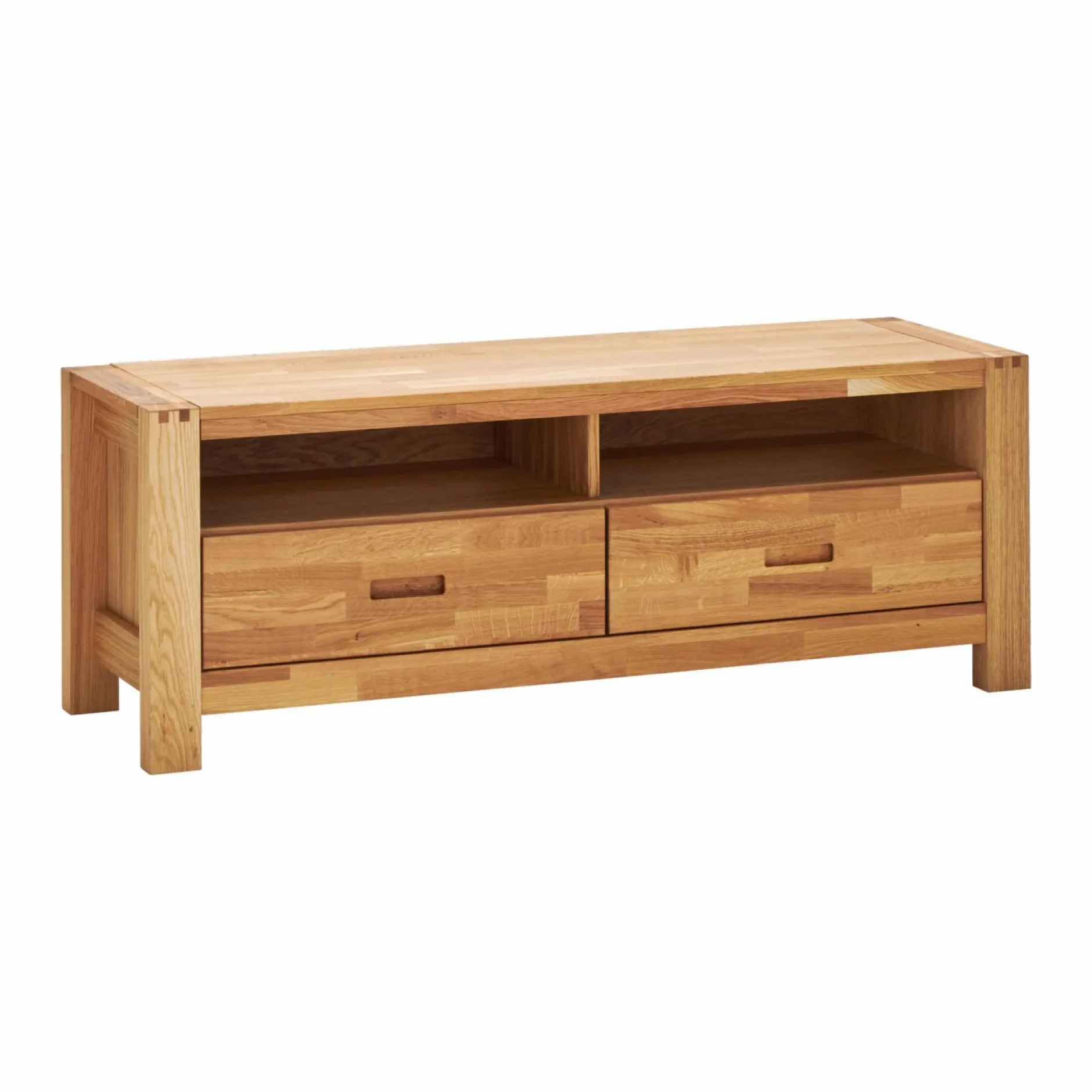 Le meuble TV Luminescence est en chêne abouté et panneaux de particules plaqués chêne, finition huilée.
