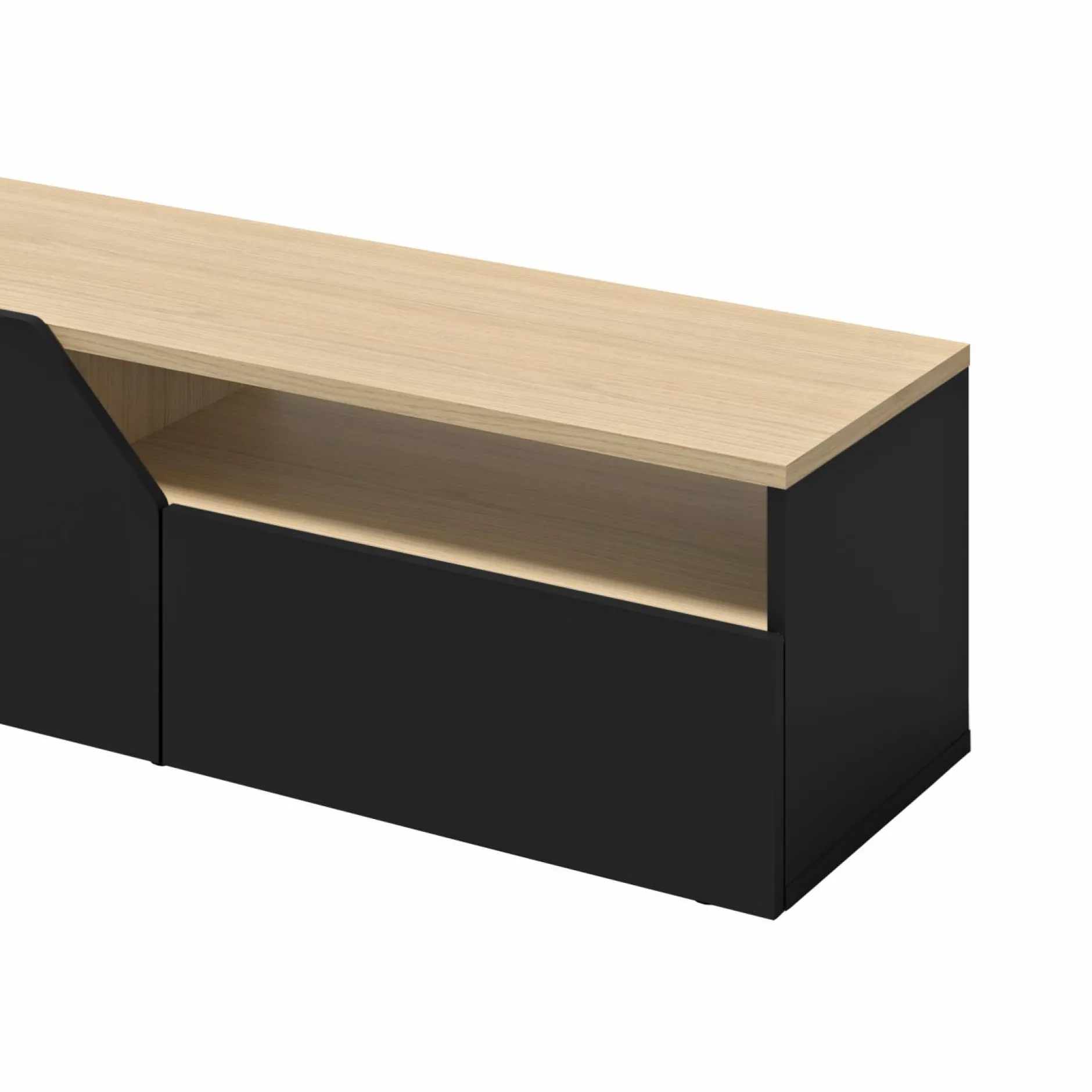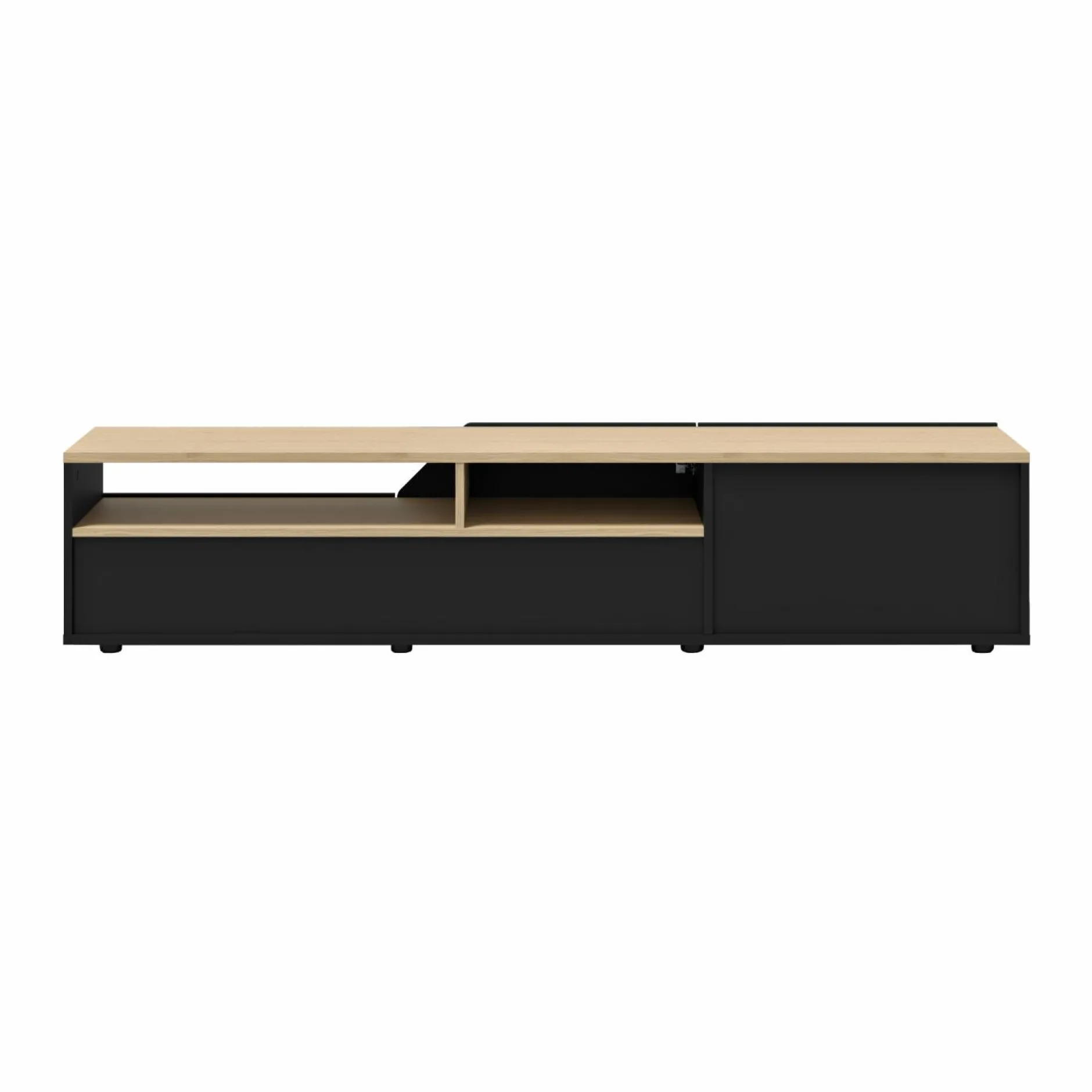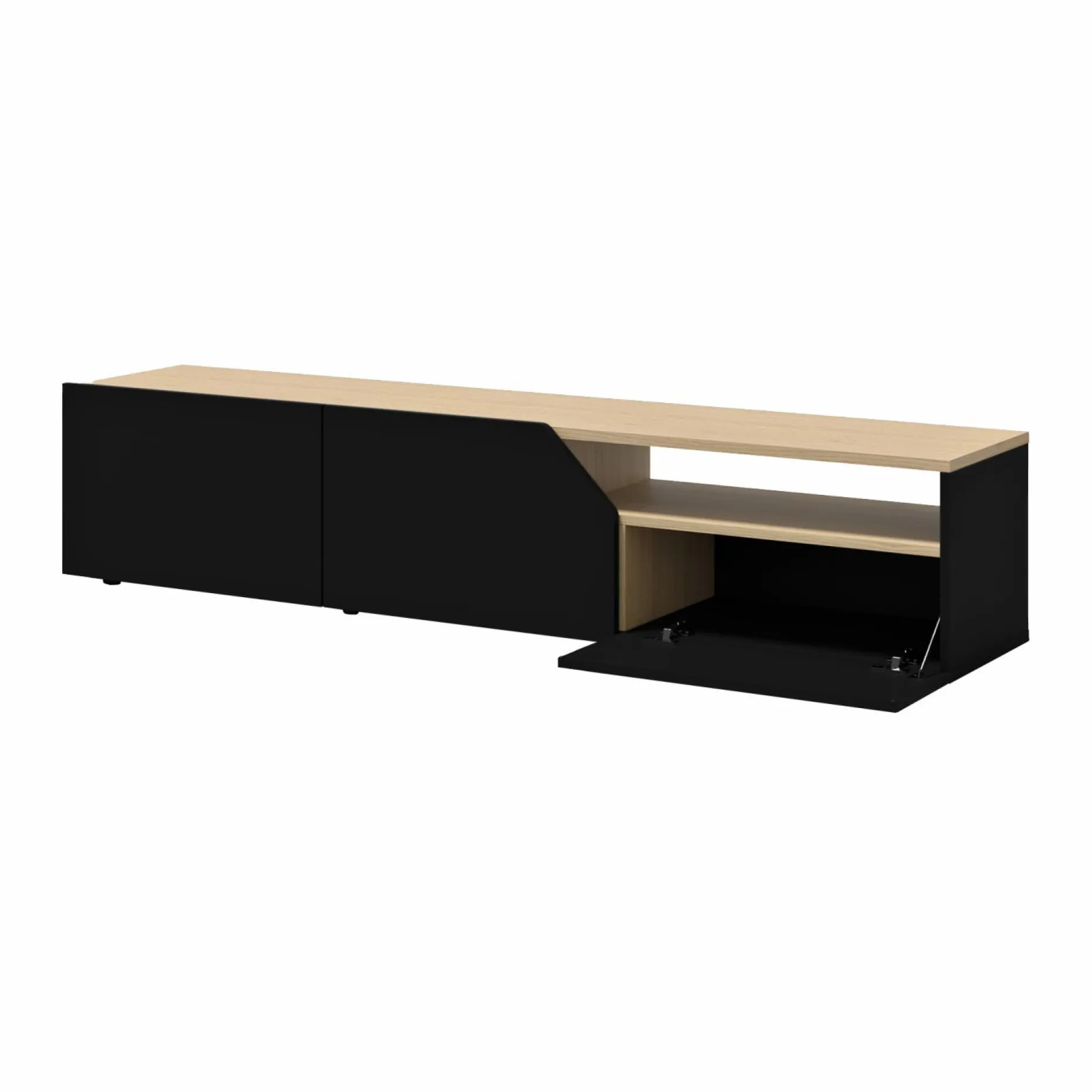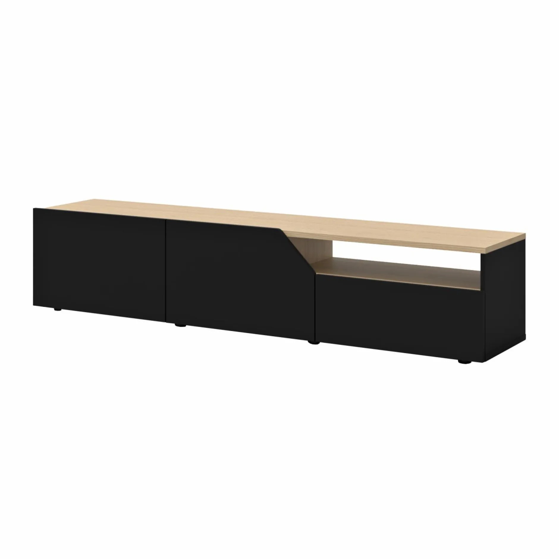 Son plateau offre un joli placage chêne et apporte un côté chaleureux à la pièce. Ce meuble TV est minimaliste grâce à ses portes sans poignée et il est ainsi parfait pour les séjours contemporains.