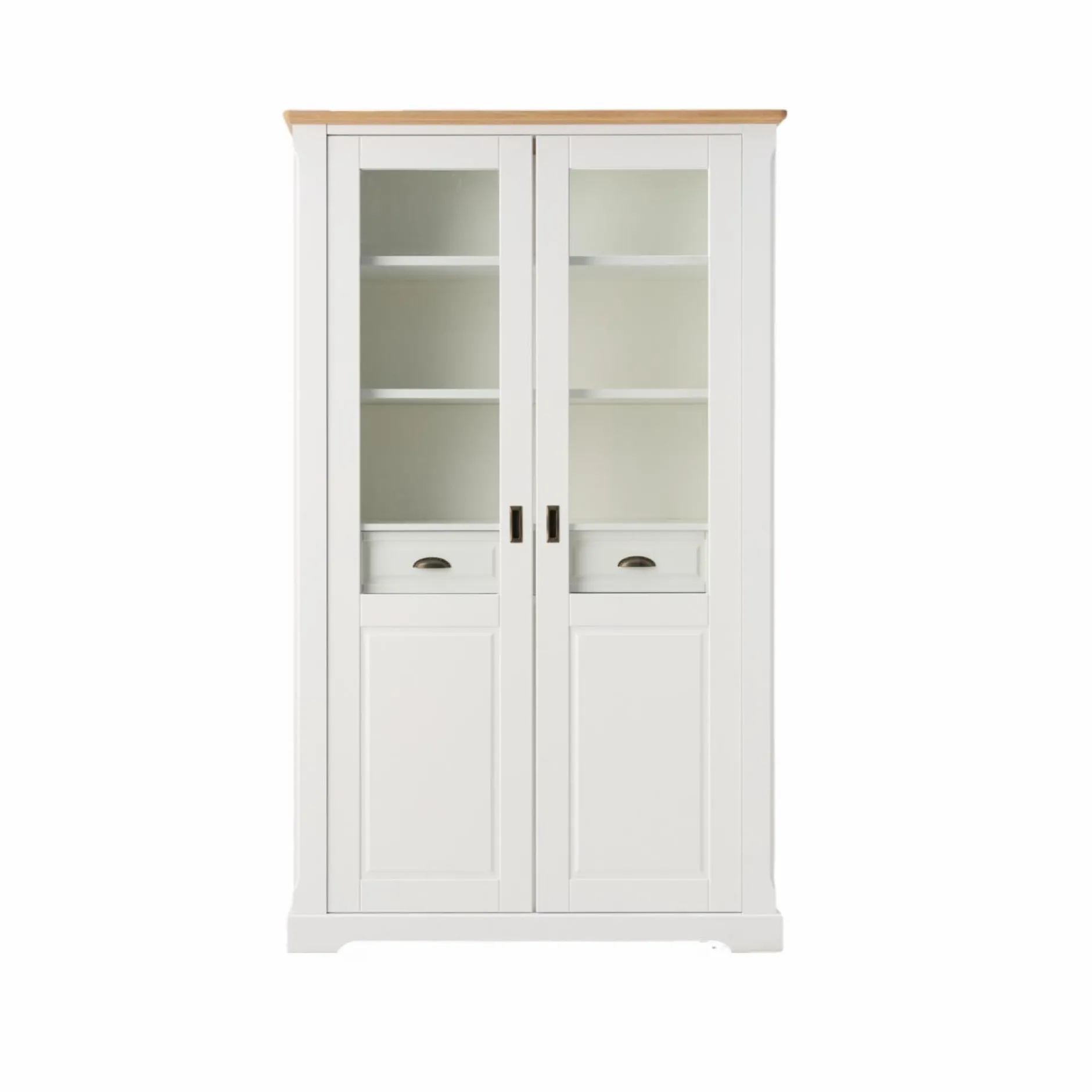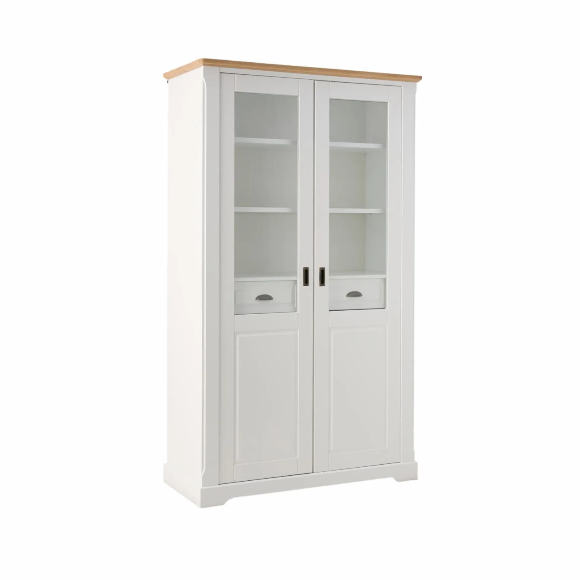Fonctionnelle, cette vitrine permet de ranger votre vaisselle ou votre linge de table. Derrière les portes se cachent deux tiroirs pour organiser les objets plus petits. Les étagères sont réglables pour adapter l’espace de rangement à vos besoins.