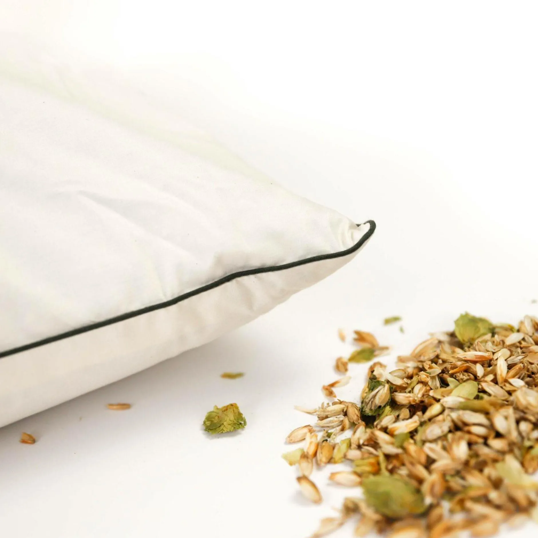 Oreiller au Houblon des Flandres avec son garnissage en balles d’épeautre issu de l’agriculture biologique.