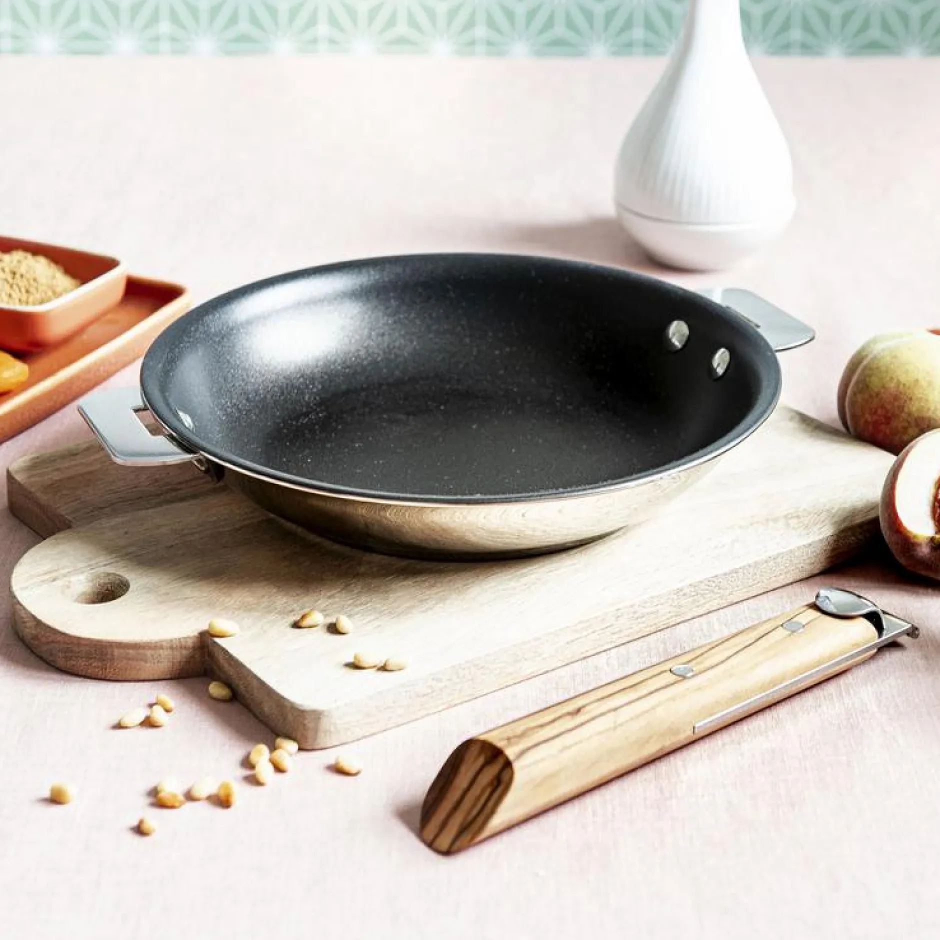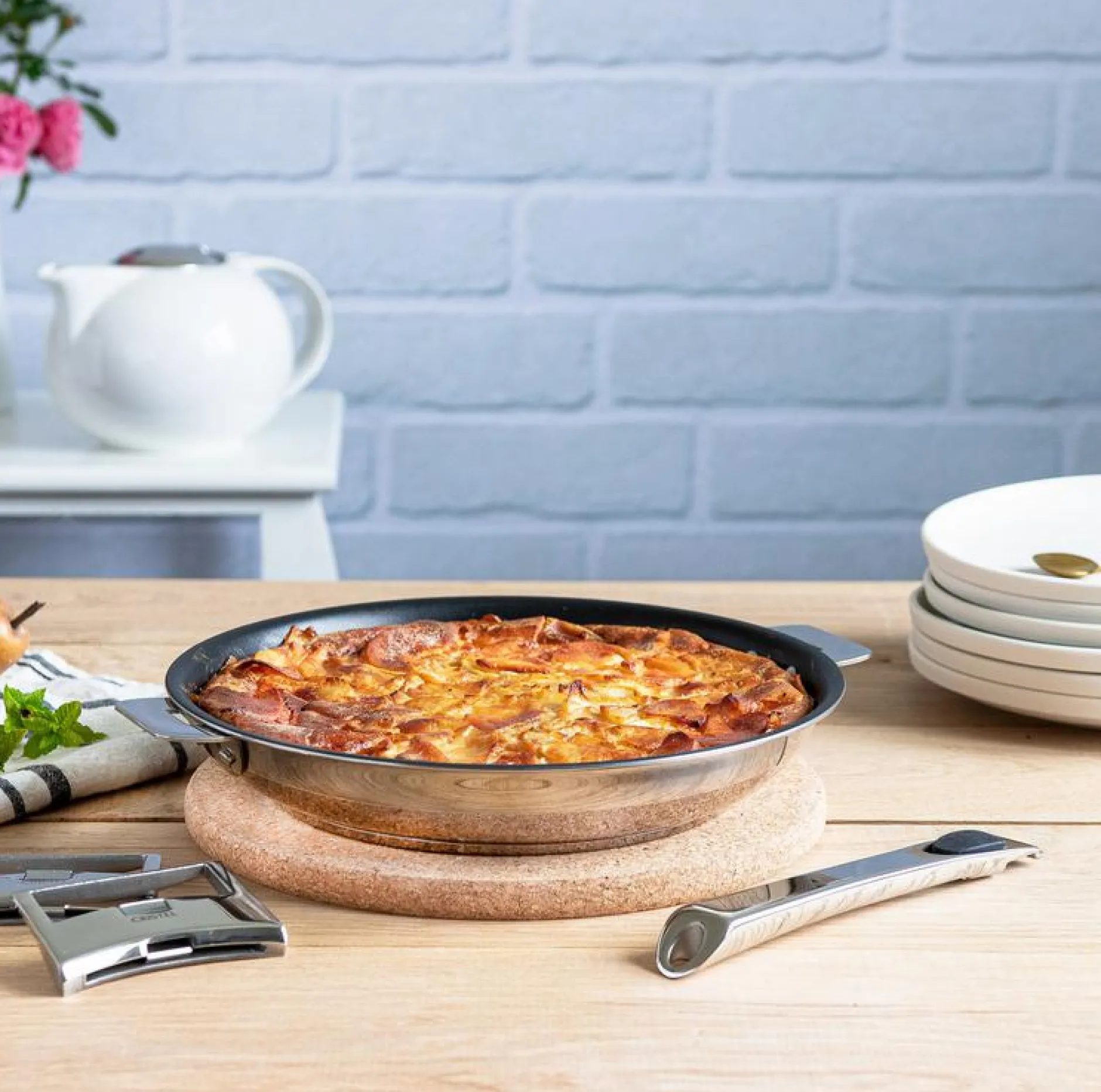 Grâce à sa finition effet miroir, la poêle Casteline passe du feu à la table avec élégance. Son fond thermodiffuseur permet également de conserver la température de votre préparation lors du service.