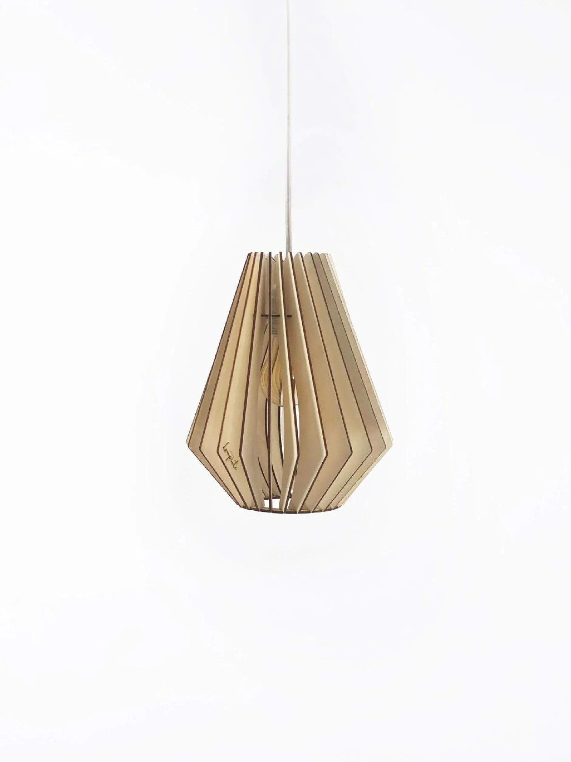 La lampe crée des jeux de lumières dès lors qu’elle est allumée grâce à ses fines lamelles en bois de peuplier.