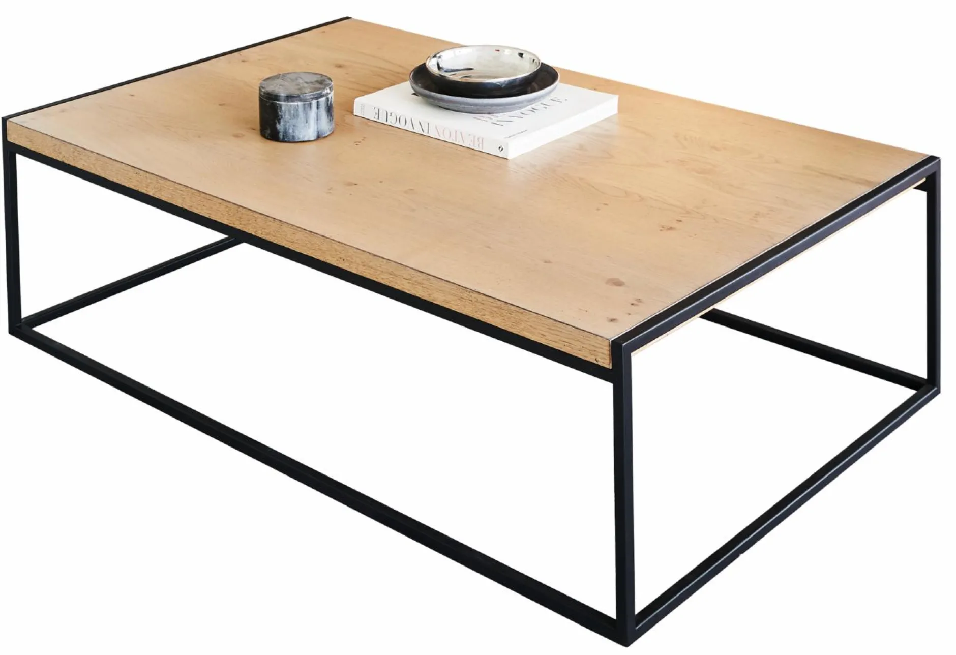 La Table basse Maddie est une table basse sobre et élégante. Elle se compose d’un plateau en panneau MDF plaqué chêne naturel à nœuds et d’un piètement en acier laqué noir mat.