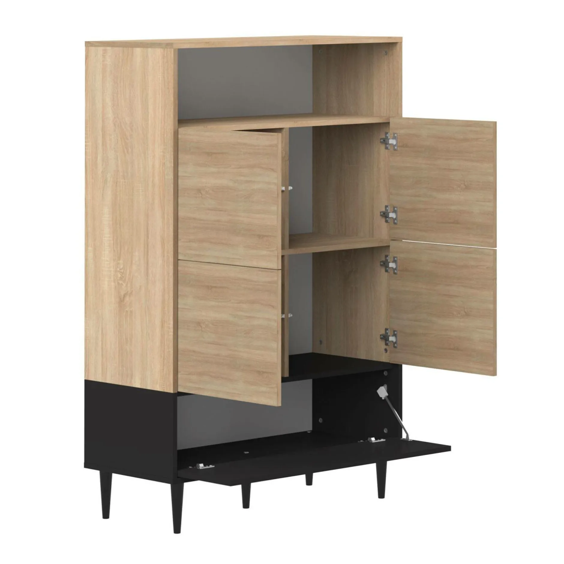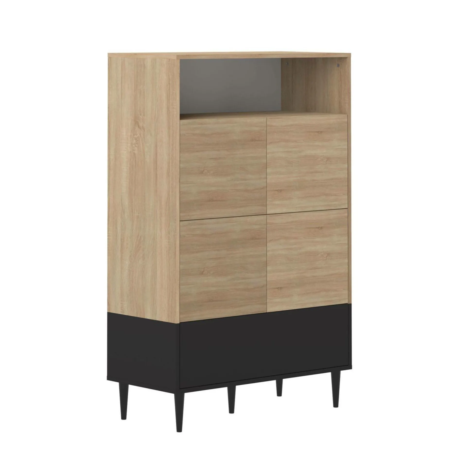 Avec son faible encombrement au sol, il s’adapte à tous les espaces en apportant un maximum de rangement. En plus de sa niche ouverte en haut, ce buffet est composé de 4 niches fermées par 4 portes en son centre et une grande niche fermée en bas sur toute la longueur du meuble. De quoi ranger toutes vos affaires, vaisselles, linge de maison… Et ajouter une touche déco !