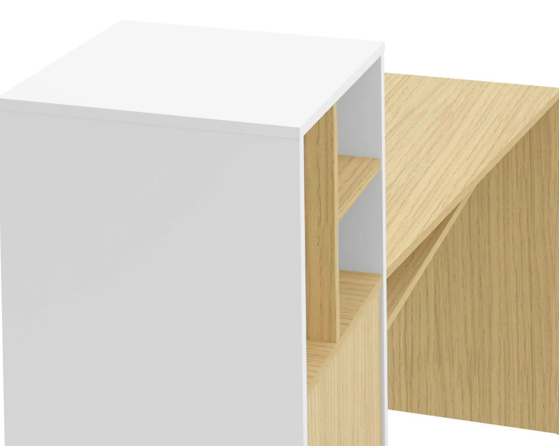 Il dispose d’une niche horizontale sous le plateau mais aussi de rangements ouverts et fermés sur le côté : 3 niches ouvertes en hauteur et une porte renfermant 2 larges étagères.