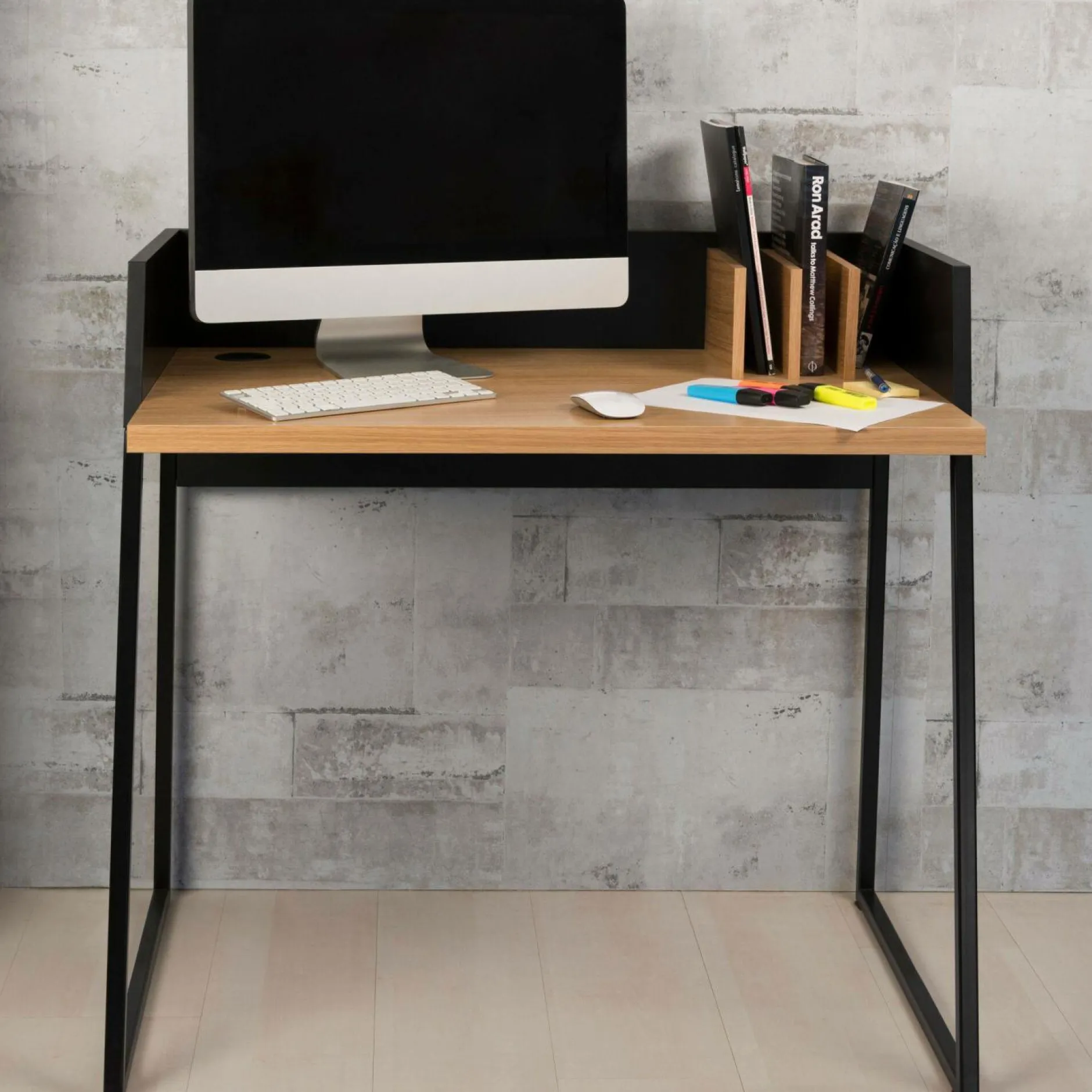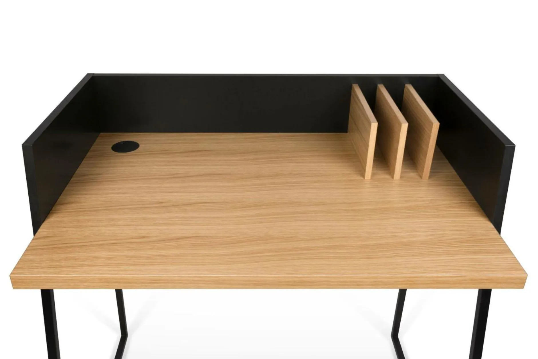 Le Bureau Tennesse est un bureau graphique et compact. Il s’inscrit dans un style résolument contemporain avec son design épuré et élégant. Il présente des pieds métalliques (laqués époxy), un plateau finition chêne ou noyer (placage bois) et un obturateur pour faire passer les câbles. Il est disponible dans 4 finitions : Blanc / Noyer (placage bois), Blanc / Chêne (placage bois), Noir / Noyer (placage bois) et Noir / Chêne (placage bois).