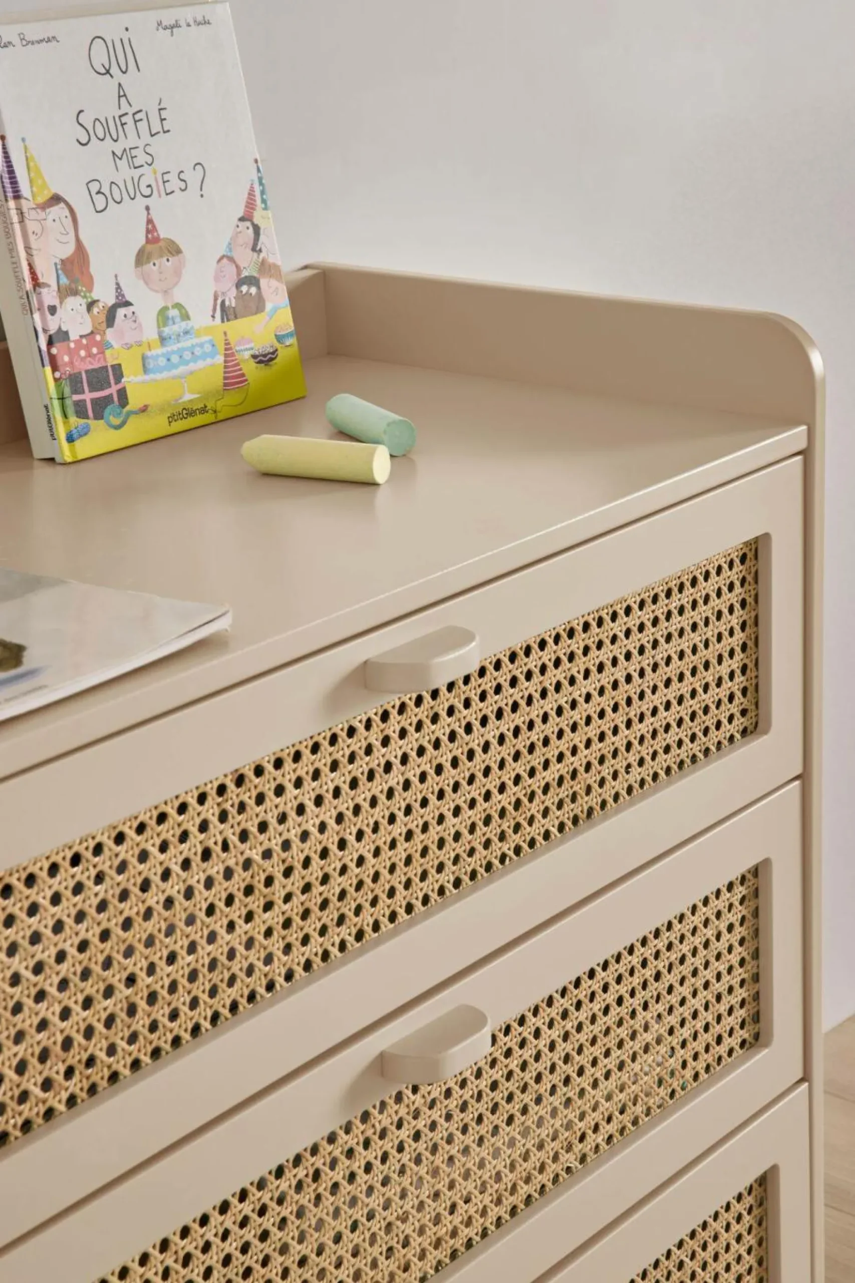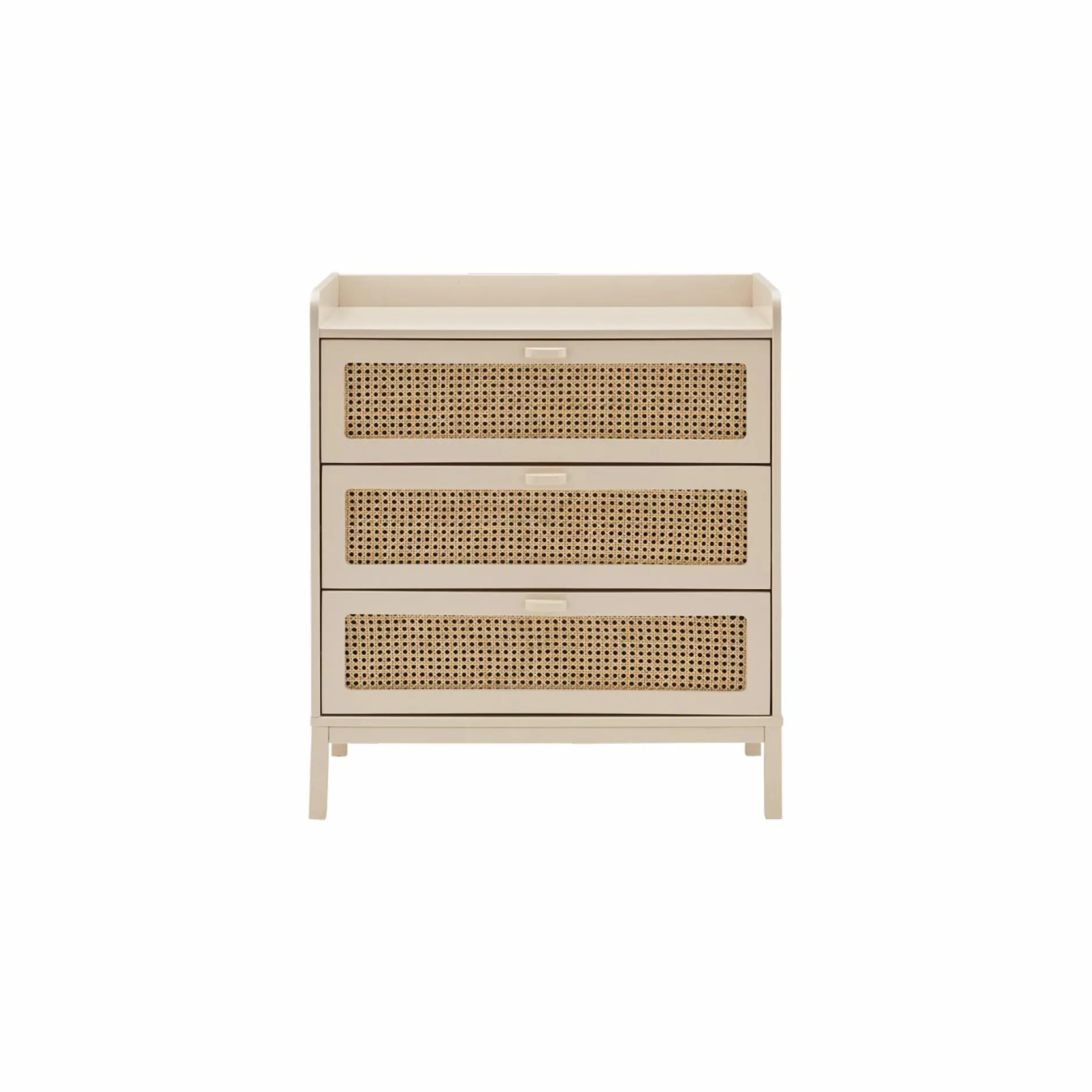 Ses trois tiroirs spacieux offrent un rangement généreux tout en conservant une esthétique soignée. Les façades en cannage, finement travaillées, apportent une touche artisanale et chaleureuse, faisant de cette commode un élément aussi pratique que décoratif.