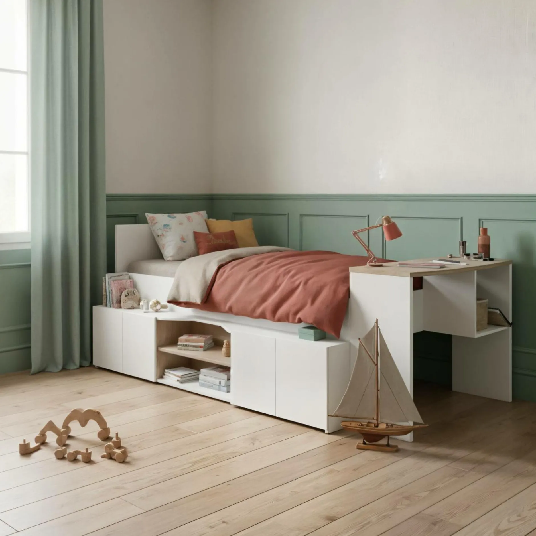 Aménager la chambre de son enfant quand on a un espace restreint est un véritable défi ! Grâce à ce lit enfant avec bureau intégré Pietro, vous maximisez chaque mètre carré et créez un espace nuit plus épuré et apaisant. C’est le choix parfait pour une petite chambre d’enfant.