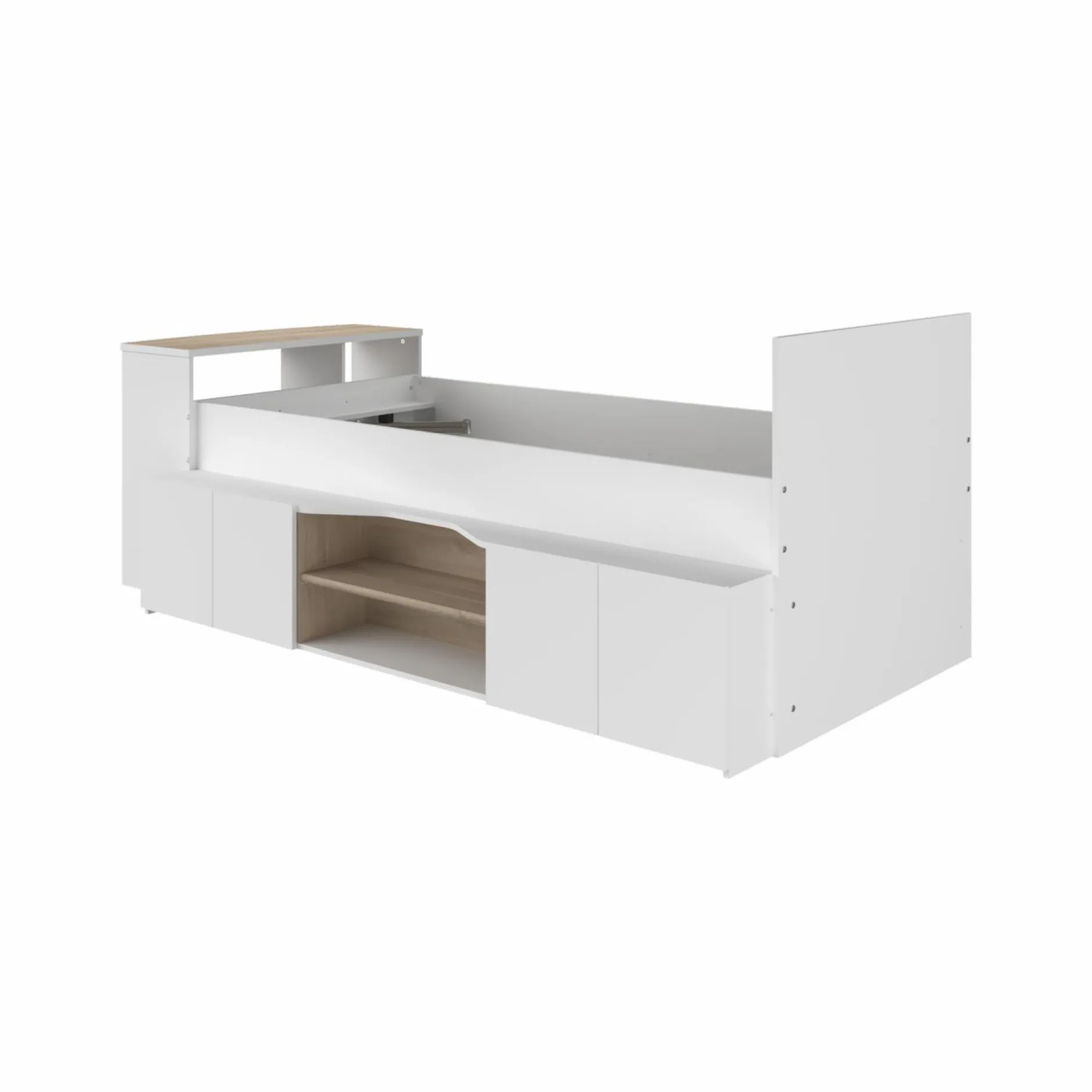 Un bureau très pratique avec sa niche est intégré au pied du lit, offrant un espace dédié aux plus beaux apprentissages de votre enfant. En utilisant les rangements latéraux pour disposer les jouets ou les livres, ce lit contribue à un aménagement optimisé de la chambre.