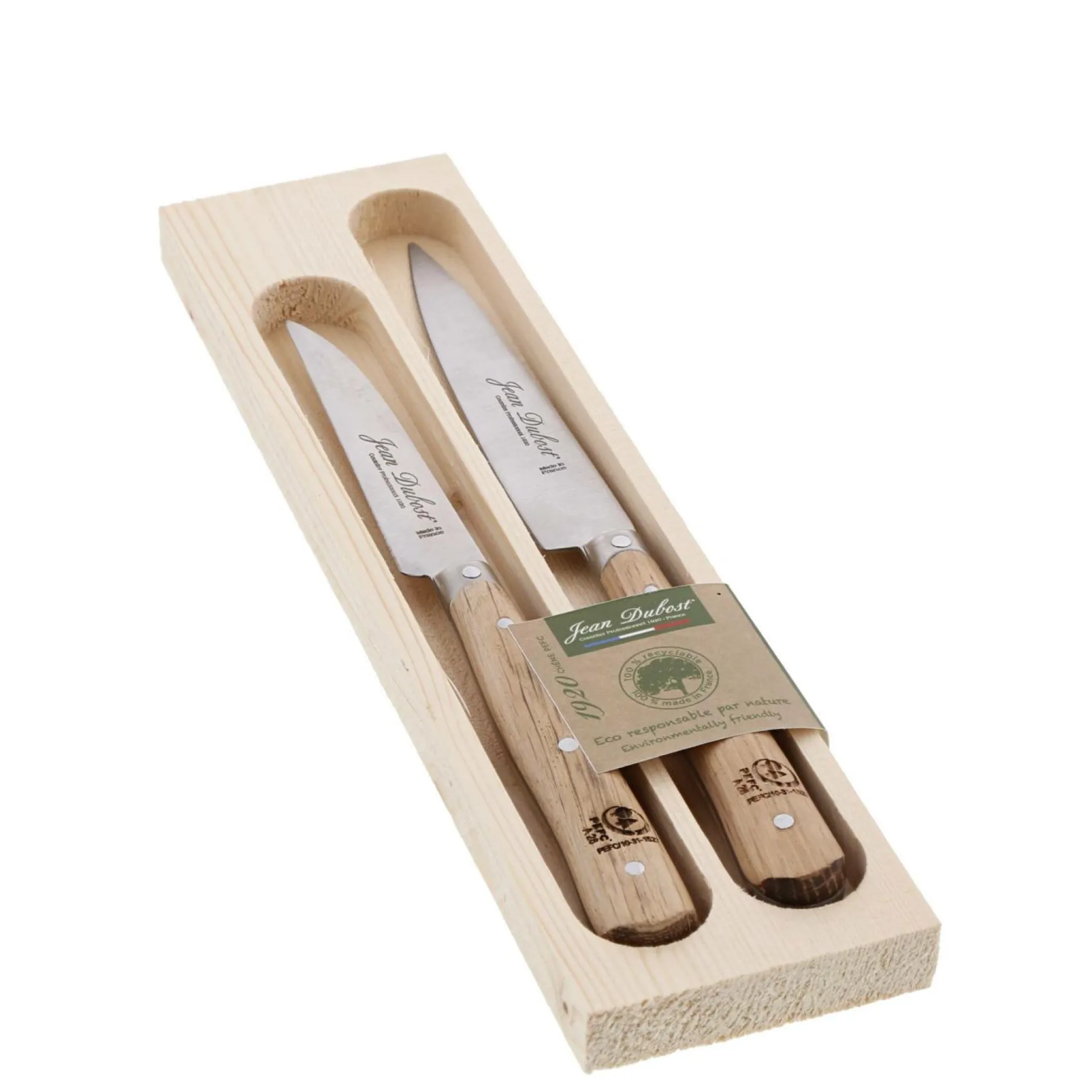 Ce 2 pièces de cuisine 1920 en bois de chêne JEAN DUBOST se compose d’un couteau d’office de 8 cm et d’un couteau multi-usage de 10 cm, le tout rangé dans son coffret alvéolé en bois.