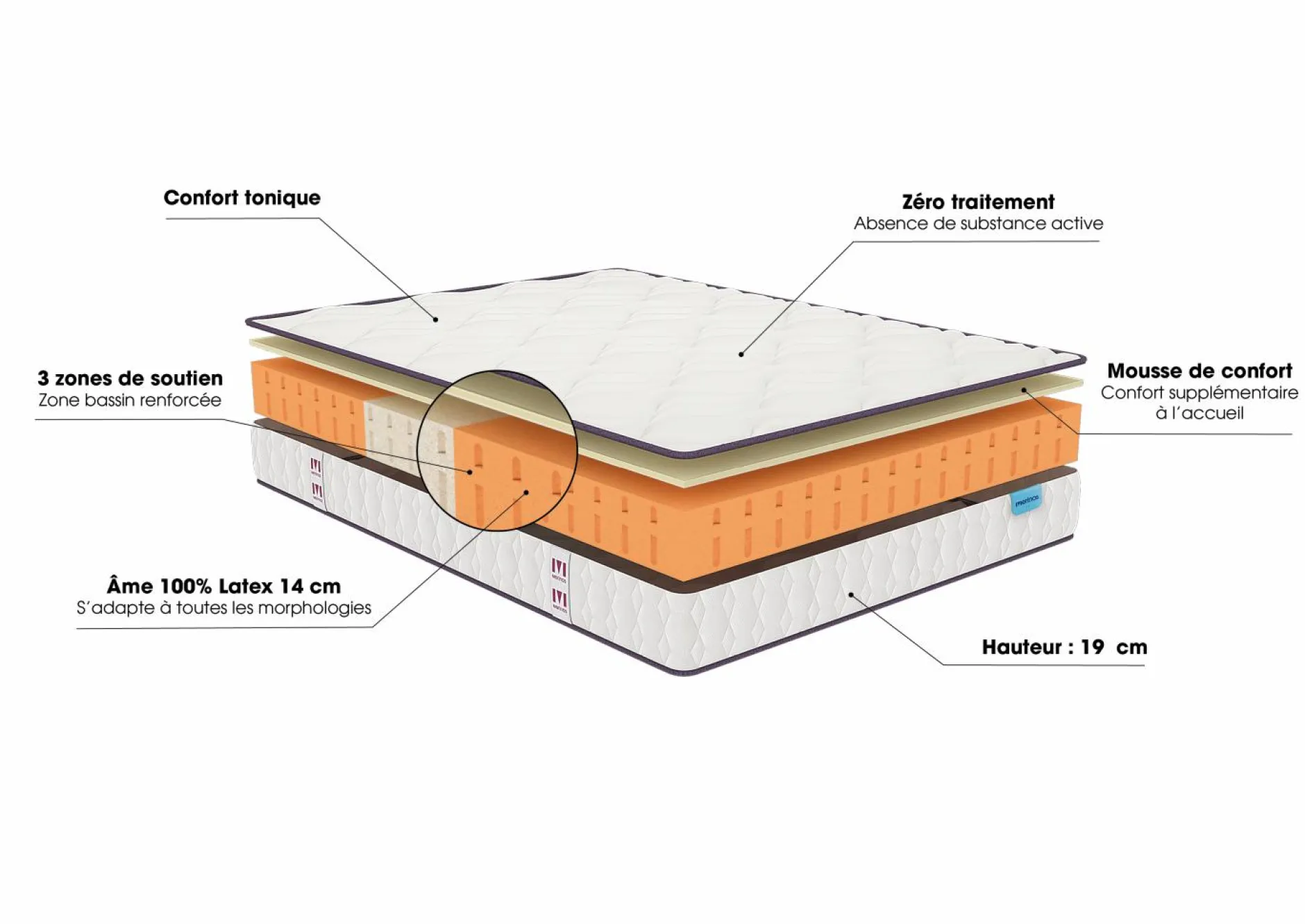 Son matelas en latex assure un soutien et un accueil ferme, avec deux faces de couchage adaptées à chaque saison : plus chaleureuse en hiver, plus aérée en été. Son tissu doux et garanti sans traitement chimique.