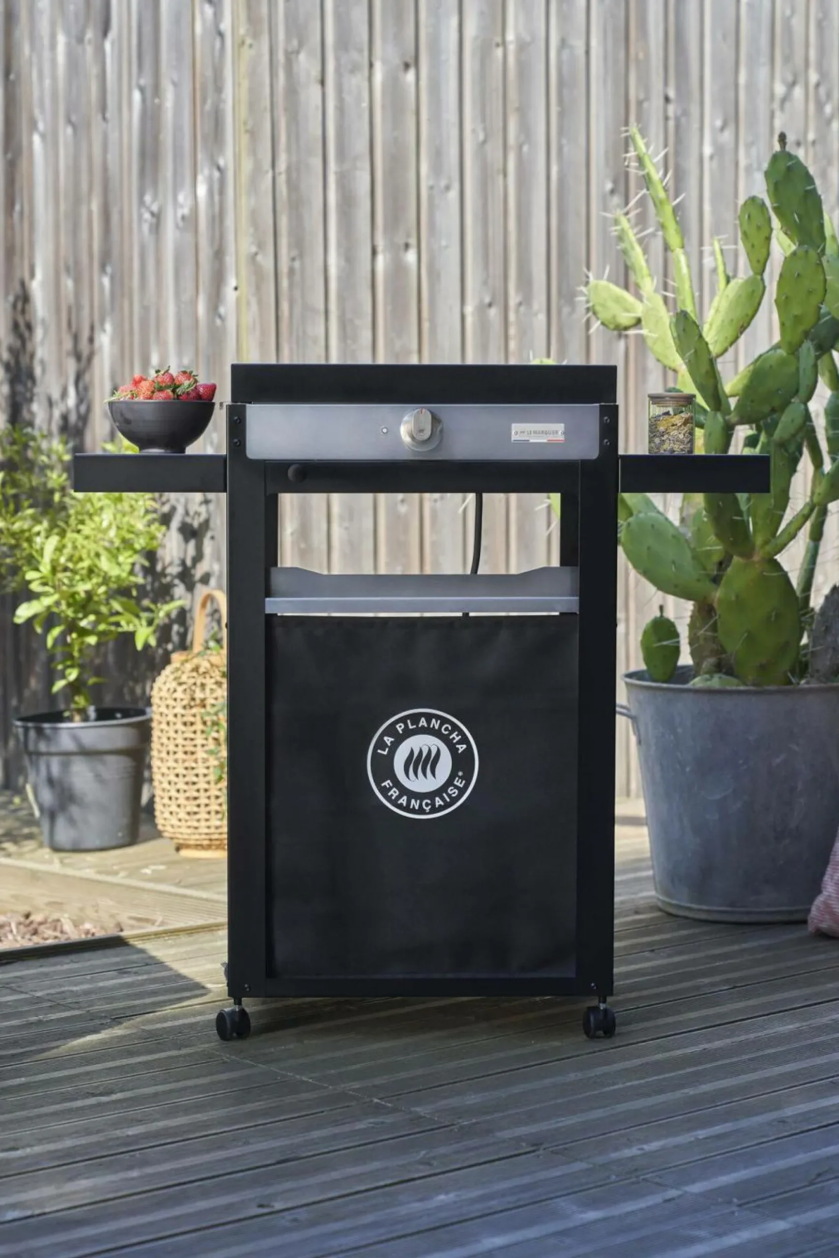 Cet ensemble réuni une plancha, un chariot modulable et un couvercle de protection. C’est un ensemble pratique et simple à déplacer grâce à ses 4 roues directionnelles autobloquantes et ses 2 tablettes amovibles qui peuvent prendre 3 positions. Elle servira 4 à 8 convives.