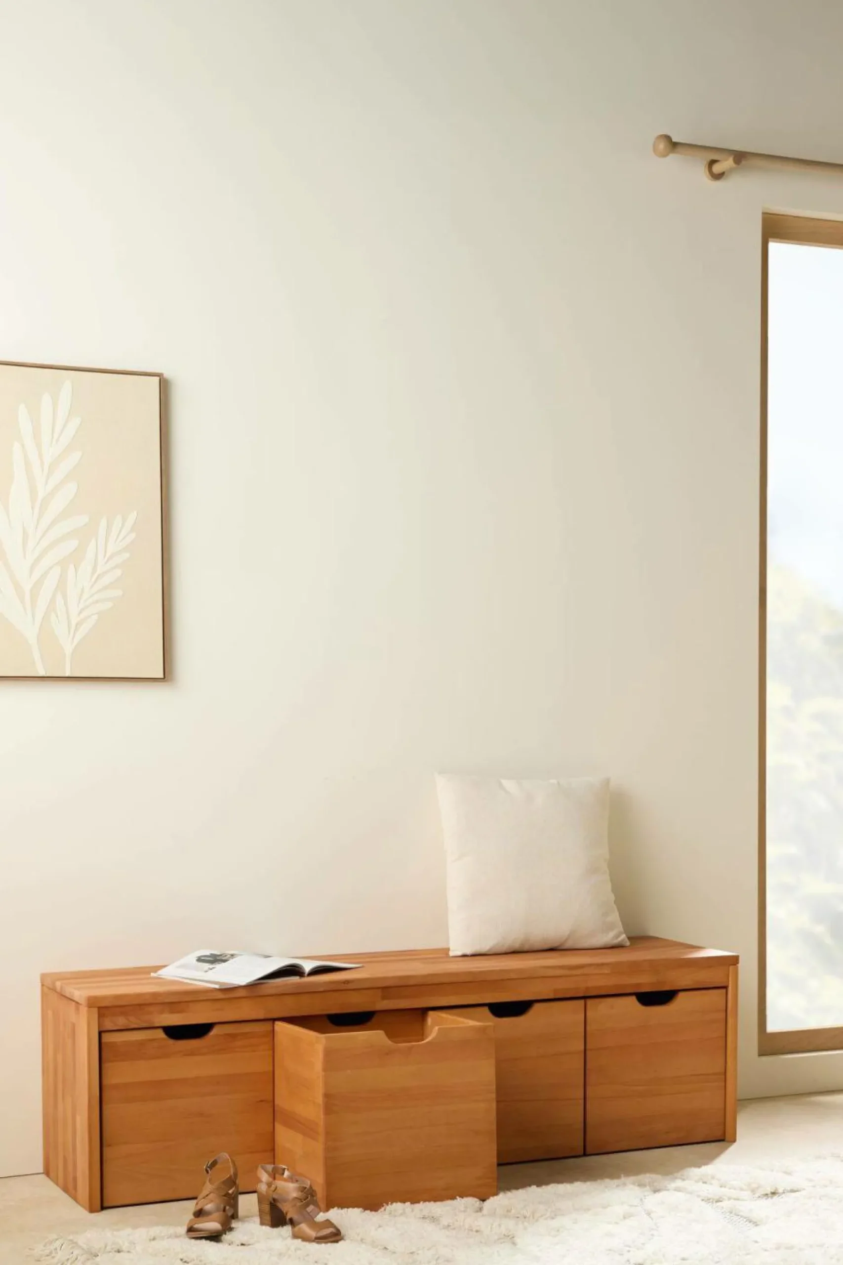 Fabriqués en chêne massif ou en hêtre massif, ces cubes sont dotés de roulettes discrètes qui facilitent leur déplacement au gré de vos besoins. Parfaits pour ranger chaussures, accessoires ou objets du quotidien, ils se glissent aisément sous un banc de la collection Cyriel ou s’utilisent séparément pour un rangement supplémentaire.