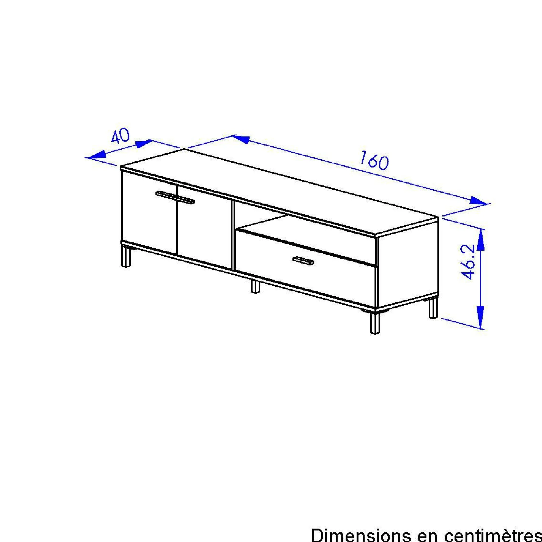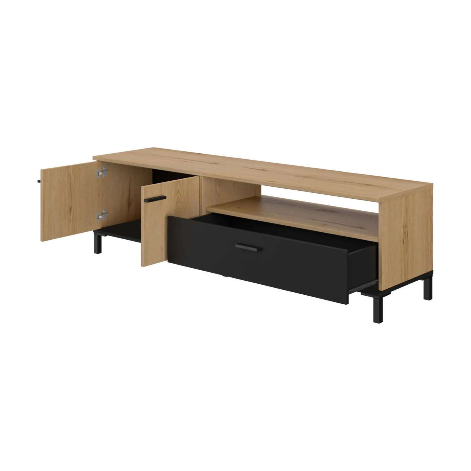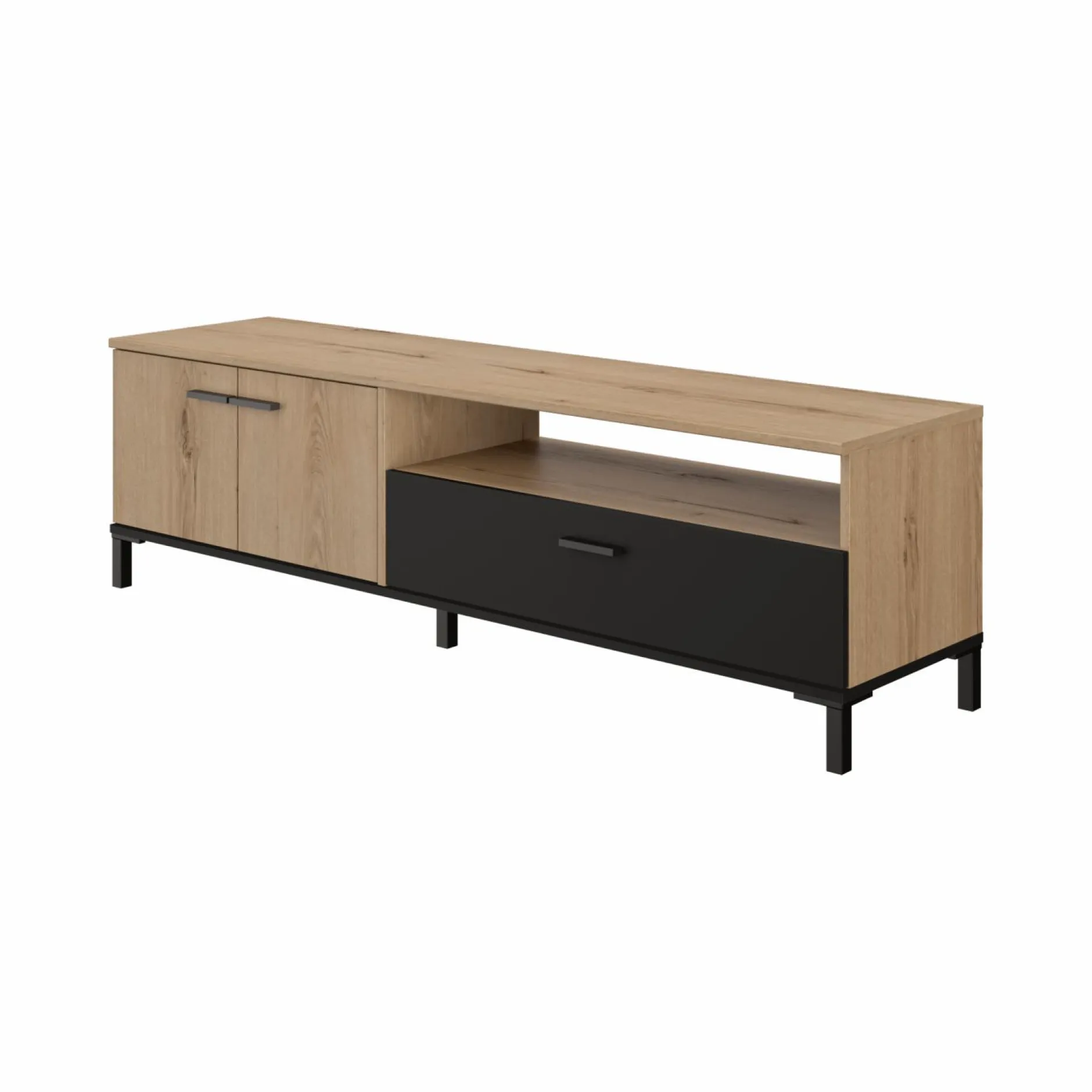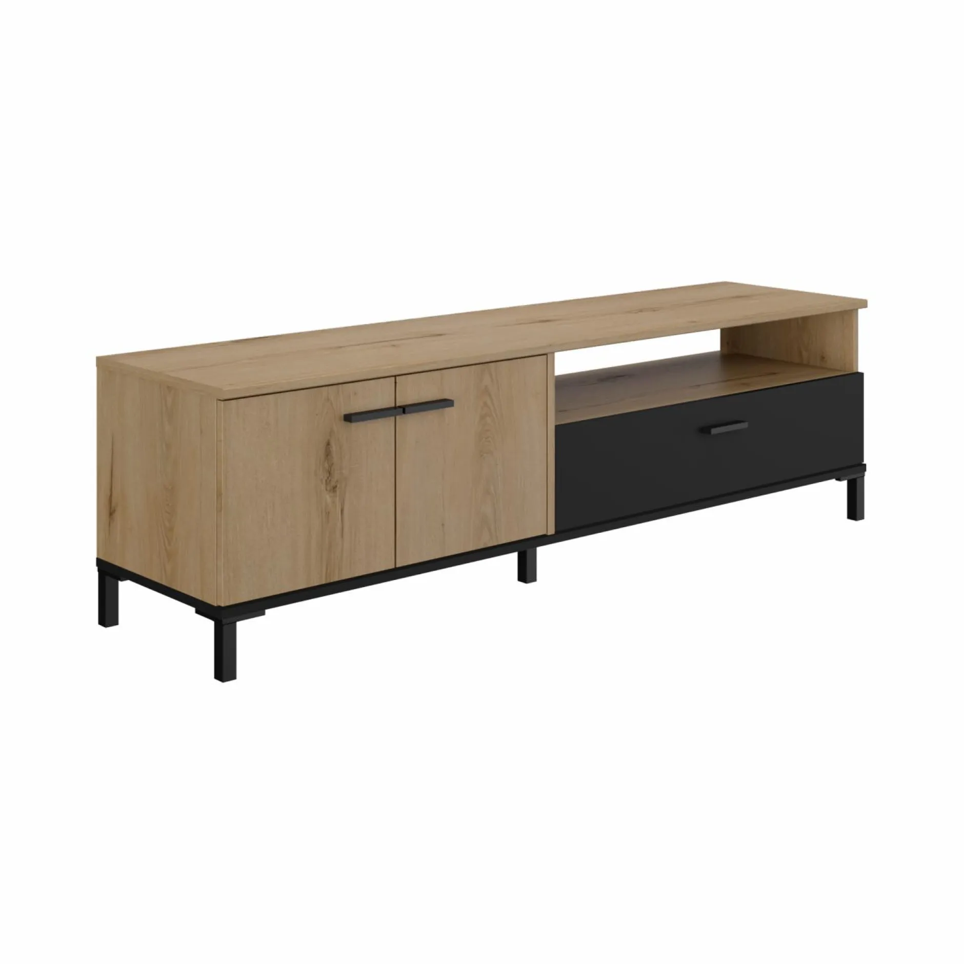 Le contraste entre la finition bois et la face de tiroir noire ajoute une touche contemporaine. Faites de votre coin TV un espace aussi agréable qu’organisé avec ce meuble qui conjugue esthétisme et fonctionnalité.
