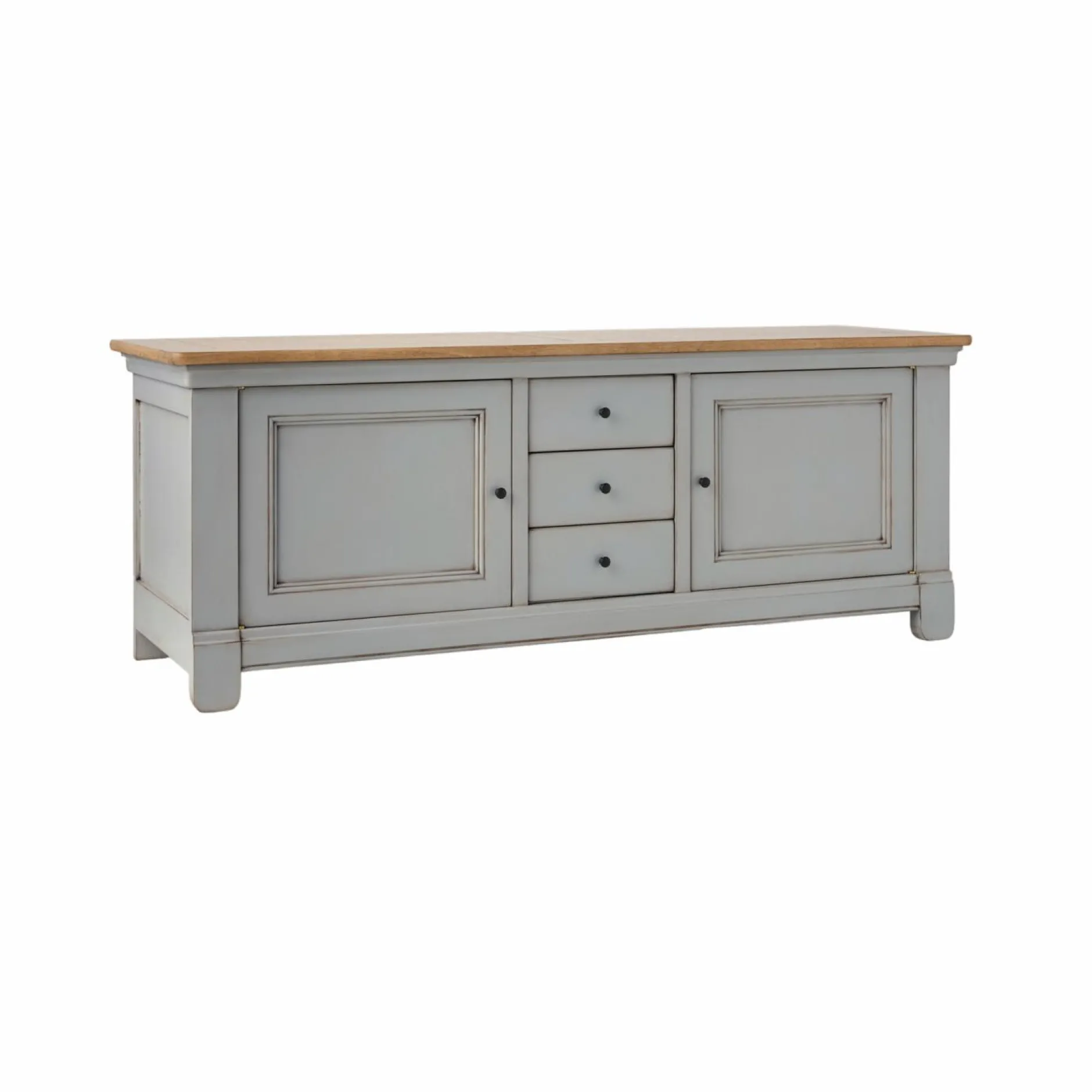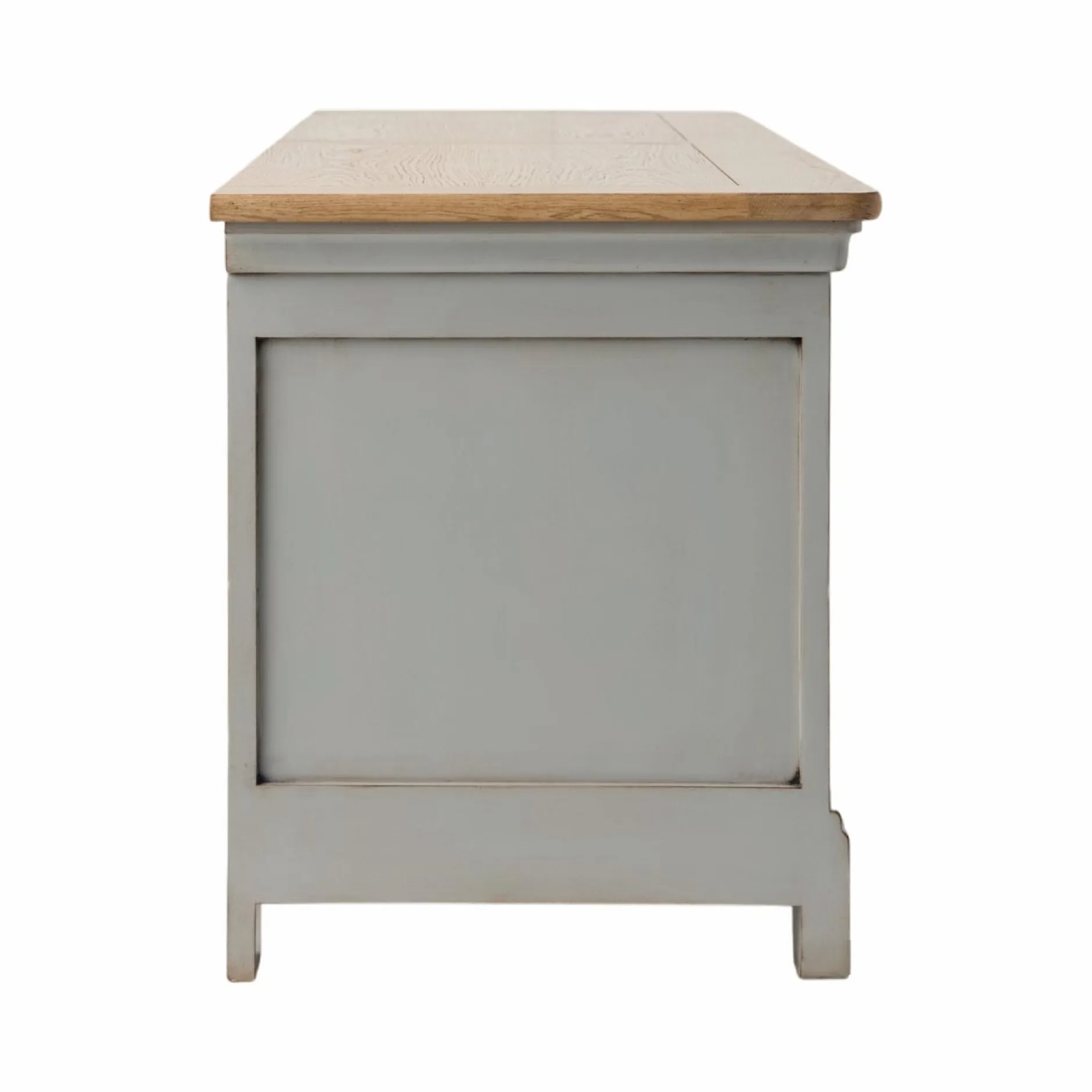 Ses lignes sobres sont mises en valeur par des moulures et un plateau en placage chêne qui réchauffe l’ensemble. Sa finition antiquaire, appliquée à la main, révèle des marques d’usure volontairement visibles, donnant à chaque pièce un caractère unique, comme patiné par le temps.