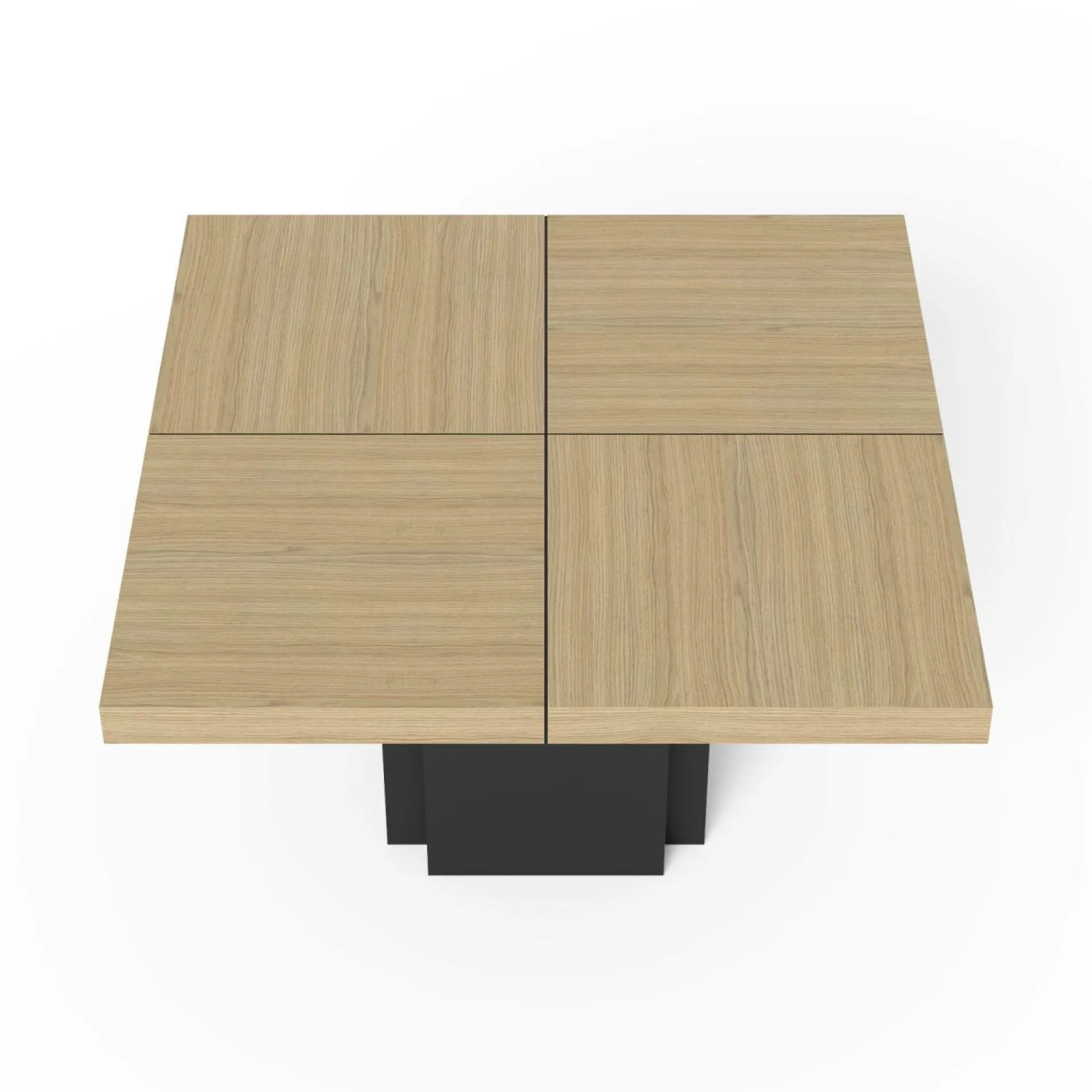 Son plateau est composé de 4 panneaux carrés à assembler et repose sur un pied centralégalement carré. Cela offre solidité etstabilité à la table et permet plus facilement l’installation desinvités autour sans avoir de pieds qui gêne.