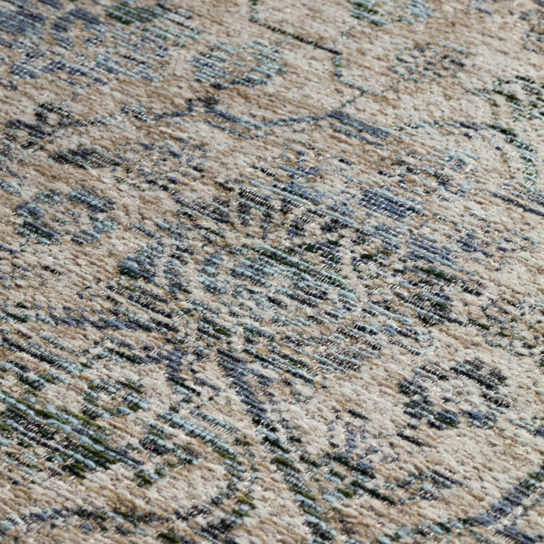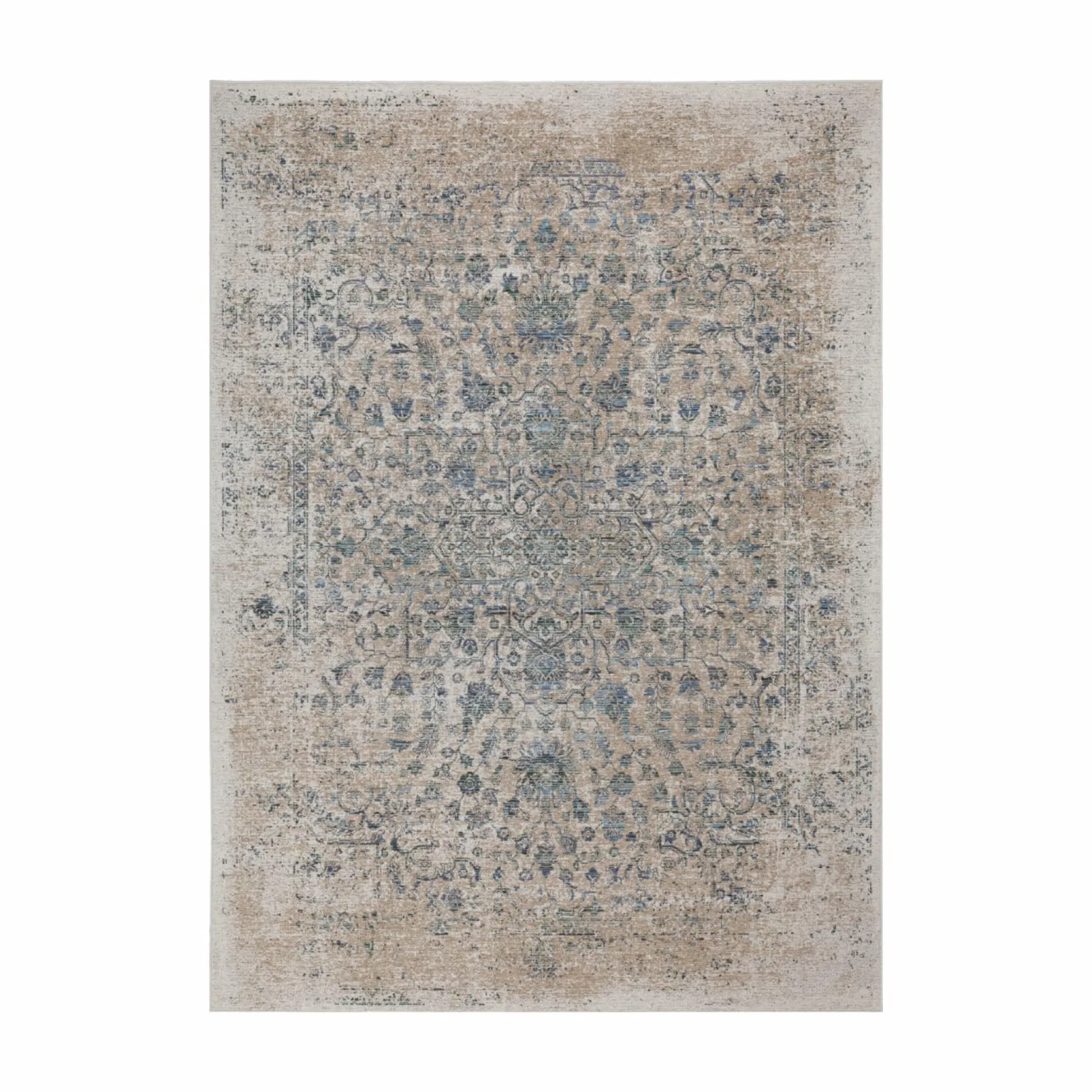 Ses tons beiges et bleus rappellent les tapis anciens chinés, tout en conservant une allure légère et actuelle. Son dessin central, à la fois floral et géométrique, estompe les contours pour créer un charmant effet texturé.